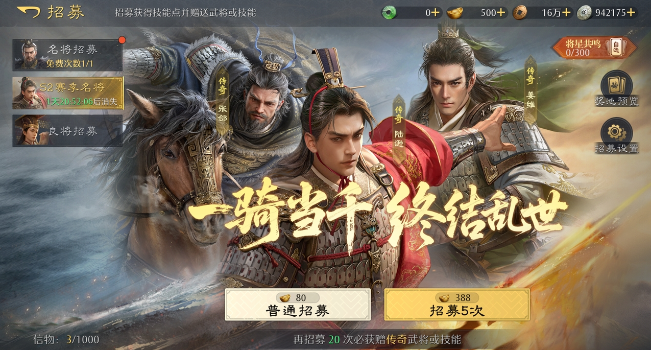 S2赛季的名将卡包中,我们引入了「将星共鸣」的全新机制。累计招募300次后,可以自选1张S2赛季名将卡包内的橙将。