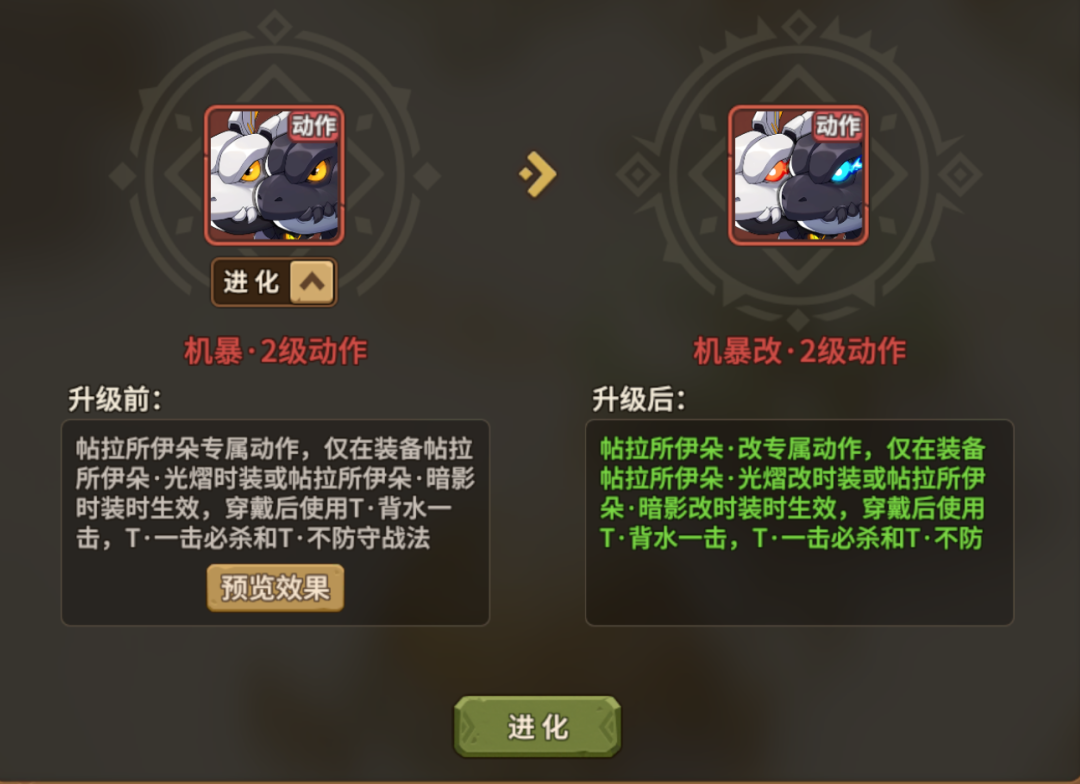 ✓与皮肤配套的特效、动作等配件,可以直接进化为适配进化后皮肤的特效、动作。