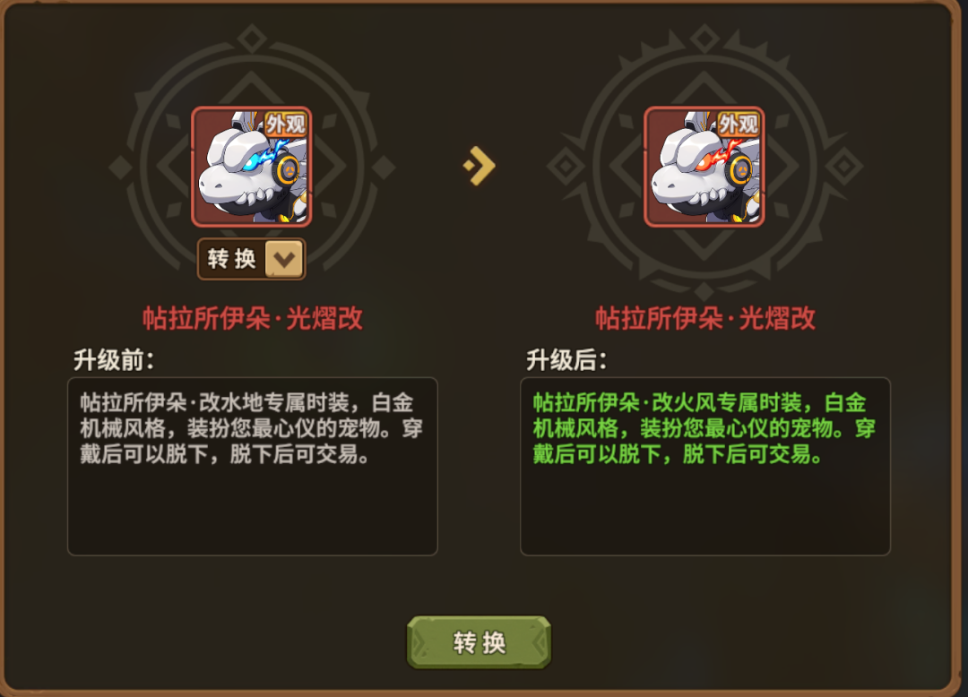 使用原有的宠物皮肤,配合对应的【幻形琥珀】,将其升级为进化后宠物的新皮肤。让您的爱宠重现往日风采!➢点击背包中的宠装→【时装改造】即可进入时装系统界面,对时装进行进化/转换/升级。