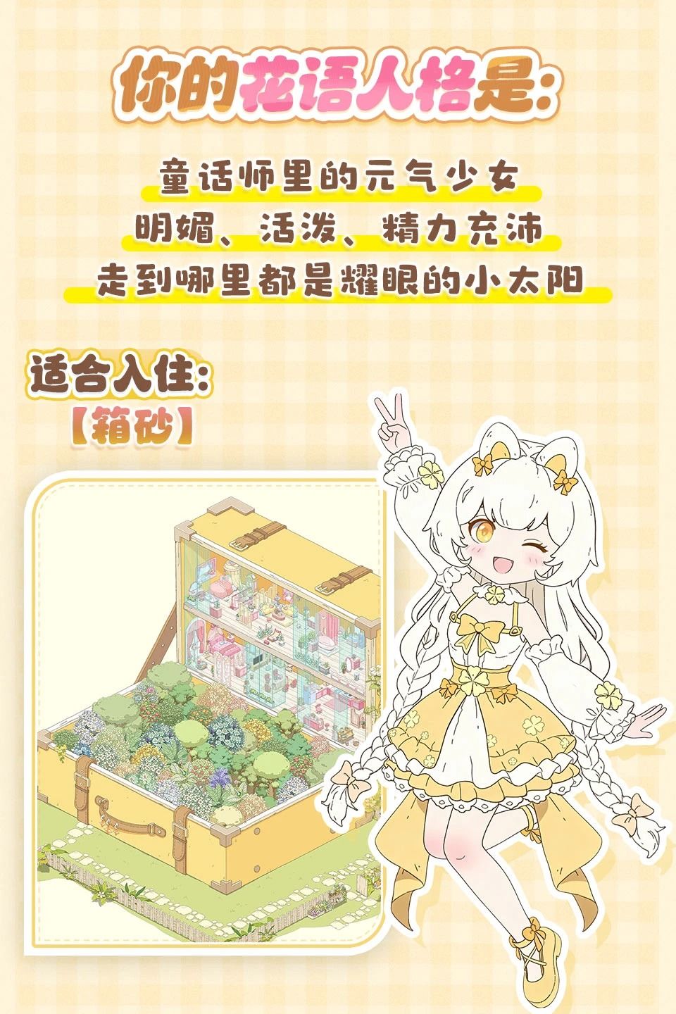 -解析:你是童话里活泼的元气小太阳☀️ 天生自带光芒,精力永远充沛,是公认的开心果。