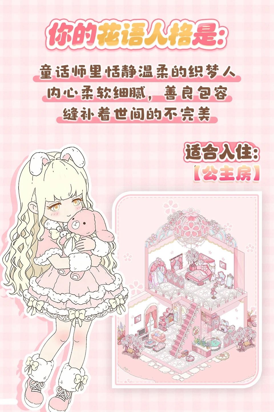 -家园归宿:你适合住进浪漫的【公主房】里,被柔软的玩偶和花朵包围。