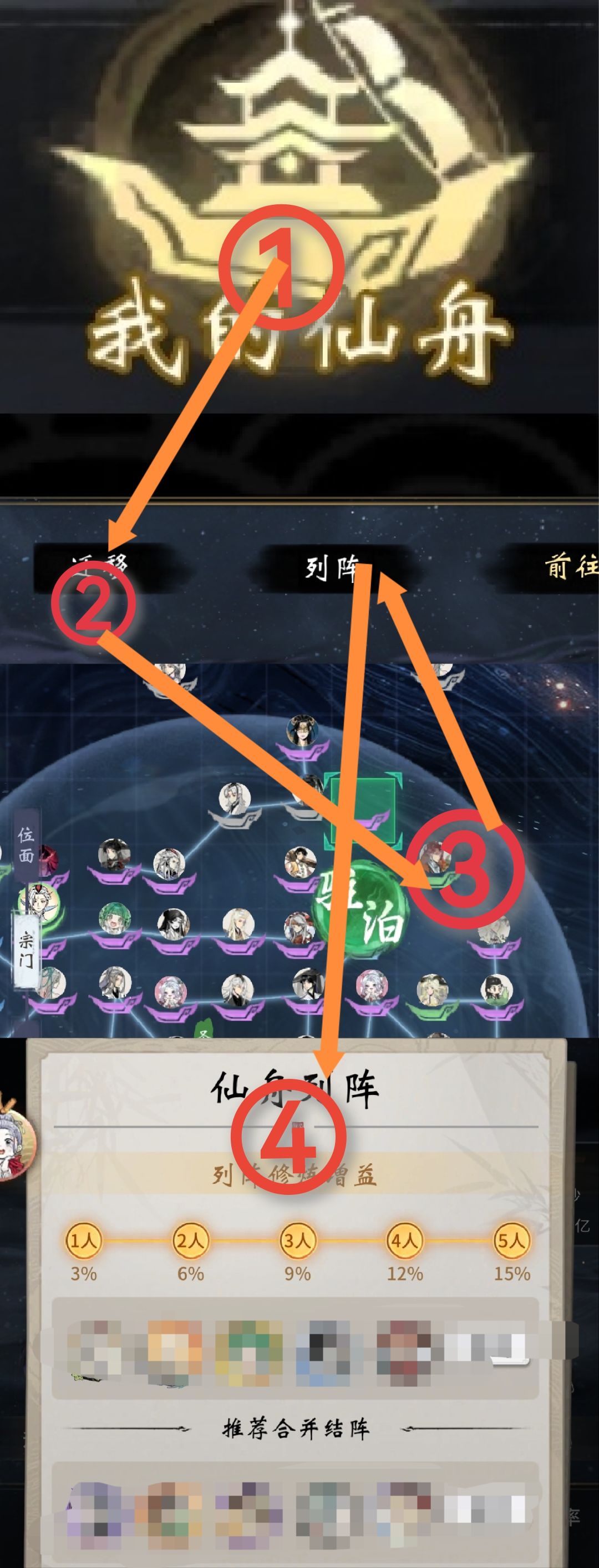 务必注意:周一更新后第一件事就是上线进入天渊玩法,点击右下角仙舟按钮→迁移→确认放置在宗门护罩内的位置(不宜与其他仙舟过远),然后仙舟按钮→列阵→与周围的仙舟结阵,这一项越早做完越有利,五人列阵的15%修炼速度给的灵气确实不少,大家记得到时在宗门群聊里呼朋唤友相互提醒!