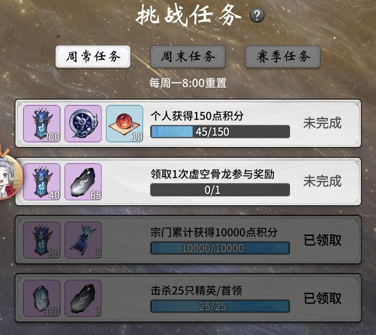 而虚空古龙则是类似神兽入侵,每天12点及18点才会刷新,全宗门的成员能一起讨伐,与神兽入侵一样根据伤害排名发奖励。但注意,打古龙没有预约,来晚了自己区的就没机会了,只能等晚上或第二天,或者入侵其他区打骨龙。这是我觉得整个活动做得最失败的一点,本来仙界就很少有人定时肝神兽入侵了,偏偏这骨龙还挂钩战功任务,不打就少兑换货币……希望日后更新能优化一下,加个预约按钮吧。