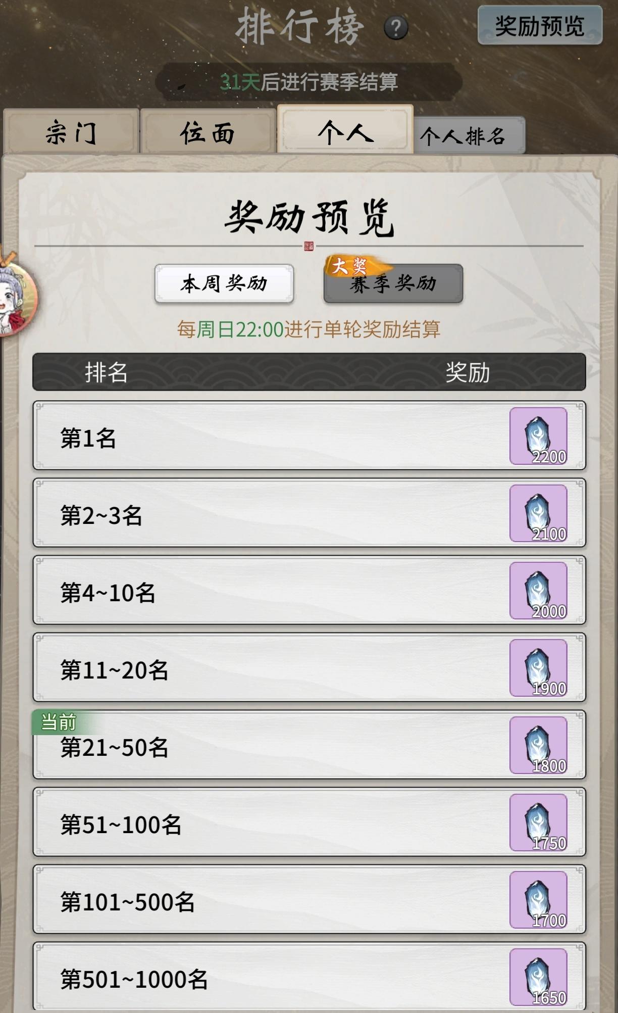天渊积分为参与天渊排行榜的指标,地位类似于仙官玩法的功德榜积分,主要通过周常、周末任务获得,也可以通过破坏其他宗门护罩、击破仙舟和修士刷取,每周结算排行榜后重置。个人积分的总和为宗门排行榜积分。每周排行榜结算时,宗门榜单会给予战功道具,而个人排行榜更为关键,每周提供天渊晶石道具,为了升级仙舟时不被晶石卡脖子,个人排行榜排名也需要注重。