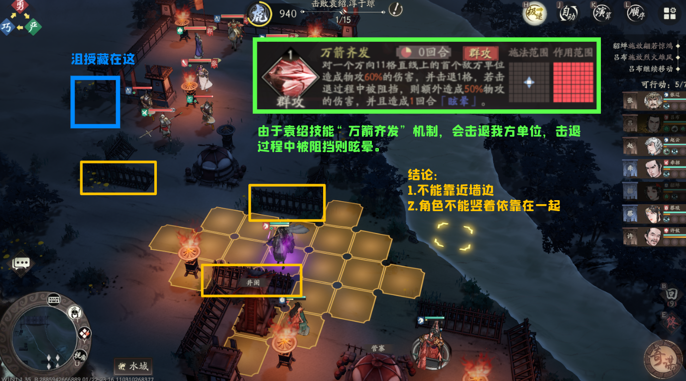 袁绍技能万箭齐发:由于袁绍技能“万箭齐发”机制,会击退我方单位,击退过程中被阻挡则眩晕。1.不能靠近墙边2.角色不能竖着依靠在一起