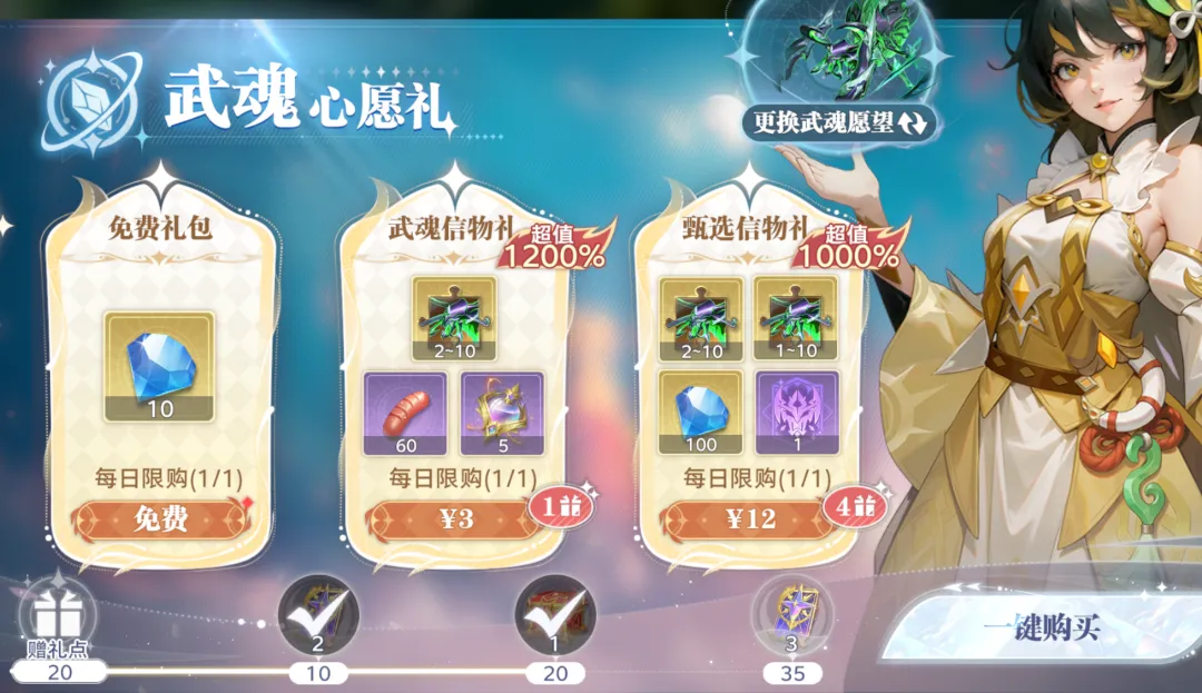 首先简单说两句这个每日15元的常规档位,此档位的5日连充活动也上过很多次了,而这波的核心奖励还是3日的5张券和5日的5张券,一共加起来就是10张券,外加2个魂环突破自选礼,这样的总计成本需要75元,说起来单论这个肯定是不值的,但如果大家过去有买过每日这个15元礼包的话,这些奖励加在一起倒也还说得过去,大家可以参考参考。