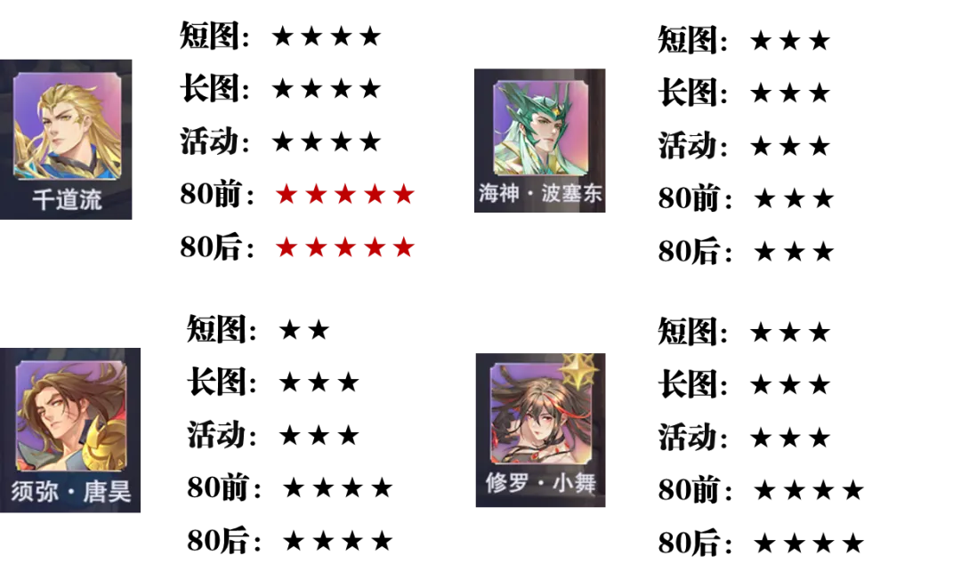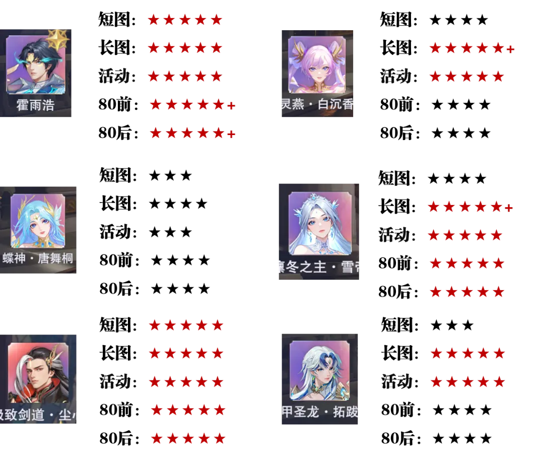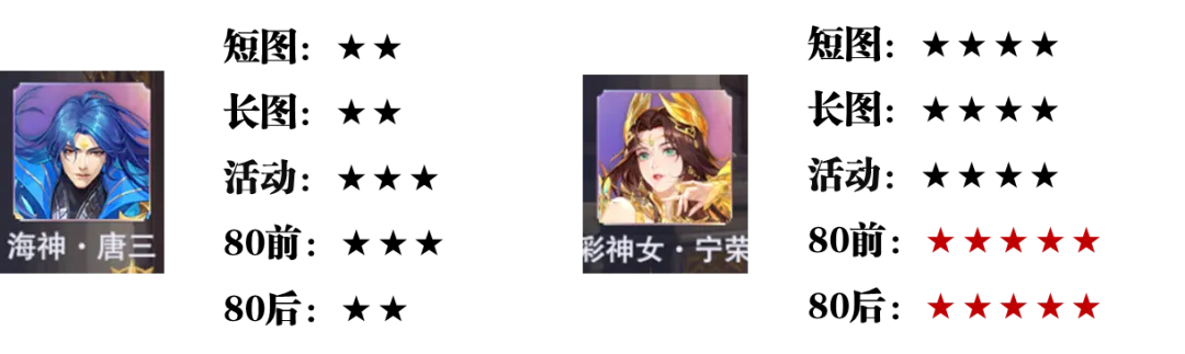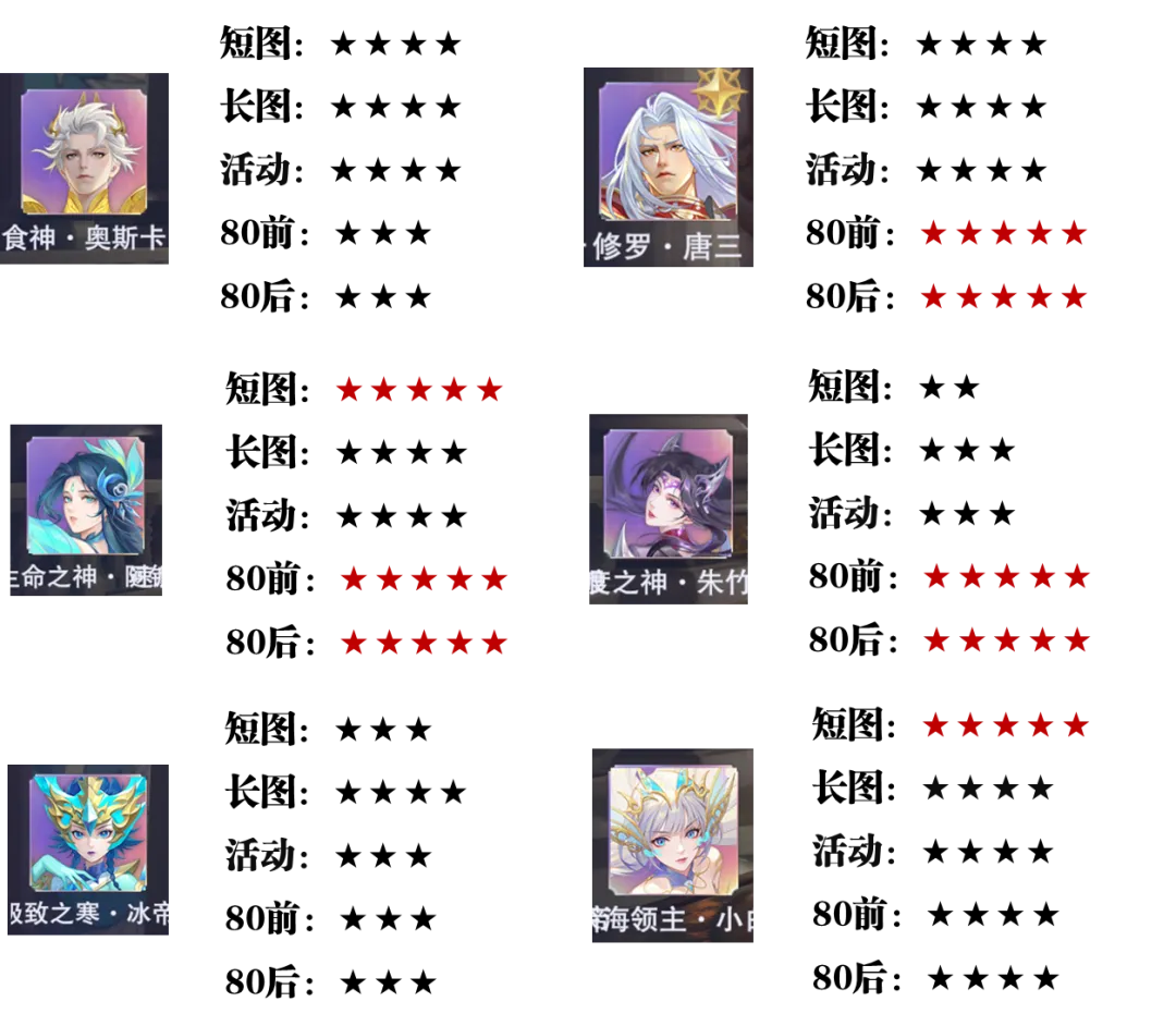 咱们的强度评级会分为五大部分,而每个部分的评级星数则按照以上标准来进行考量:(针对短图/长图的强度评级维一会更倾向于游戏中后期的表现,同时也会结合各种类型玩家的综合反馈,例如小氪、中氪和重氪玩家手中的魂师表现/上场率都会综合考量)