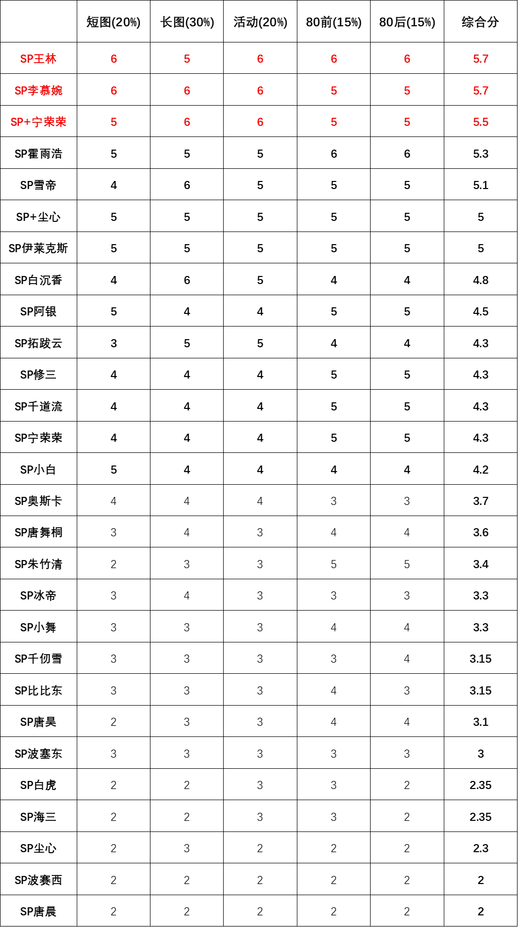 最后便是SP伊莱克斯和SP+宁荣荣了,其中伊莱克斯是因为和SP+尘心在大部分战斗场景都有一定的竞争性,他们俩到底谁更好用更取决于大家的相对练度差异和阵容差异等,无法一概而论,但SP+宁荣荣嘛则在长图和大部分活动副本中目前拥有着绝对的统治力,但在剩下的一些战斗场景中,因为战斗机制和规则的变化,也不见得她便是那独一无二的最优解,这点大家可以参考。那么如果按照上述的评星,2星算2分、3星算3分......5星+算6分的话,这18位SP魂师的排名如下(鉴于玩PVP的玩家还是少数,所以短图权重为20%,长图权重为30%,活动权重为20%,PVP权重为30%):