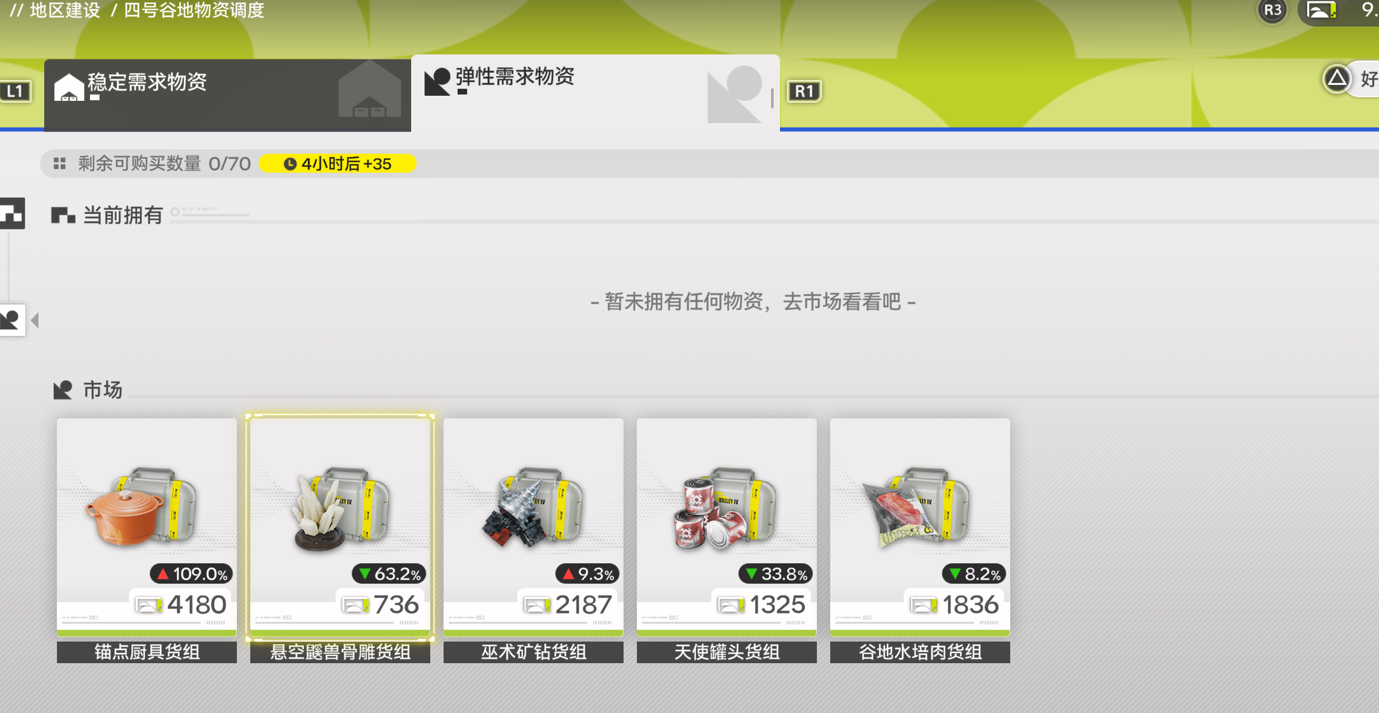 初始解锁的各种物资先不要着急兑换,对话,升级物资调度系统到2级,会解锁弹性需求物资的兑换权限: