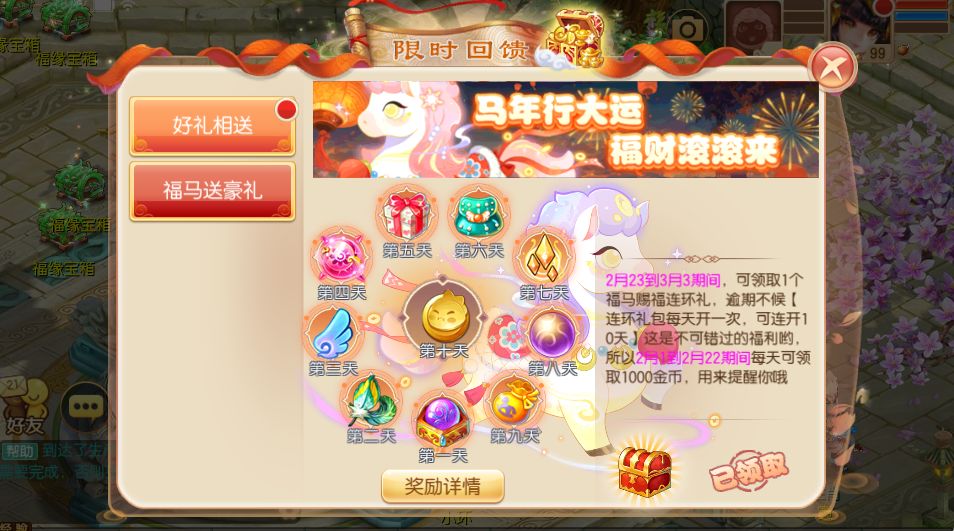 2月1日-3月3日,等级≥30级的少侠,请单人参与【福马送豪礼】活动。2月1日到22日期间,每天可领取1000金币;2月23日到3月3日期间,可领取福马赐福连环礼,礼包每天可以开启1次,可连开10天,逾期不候哦!