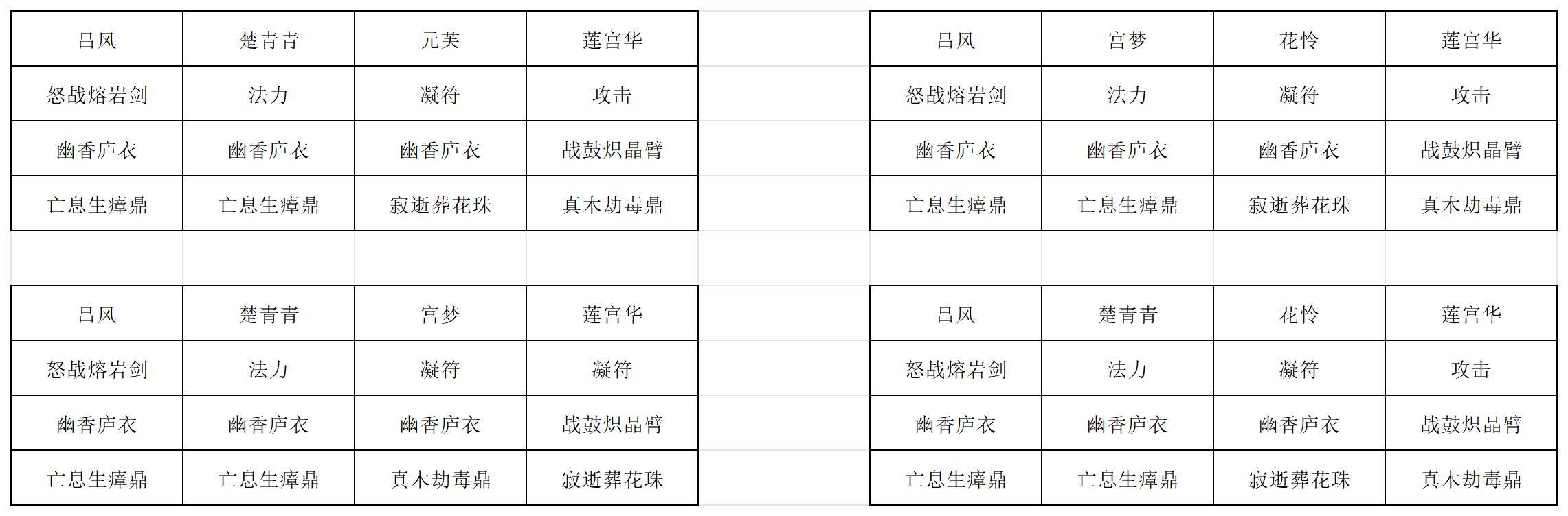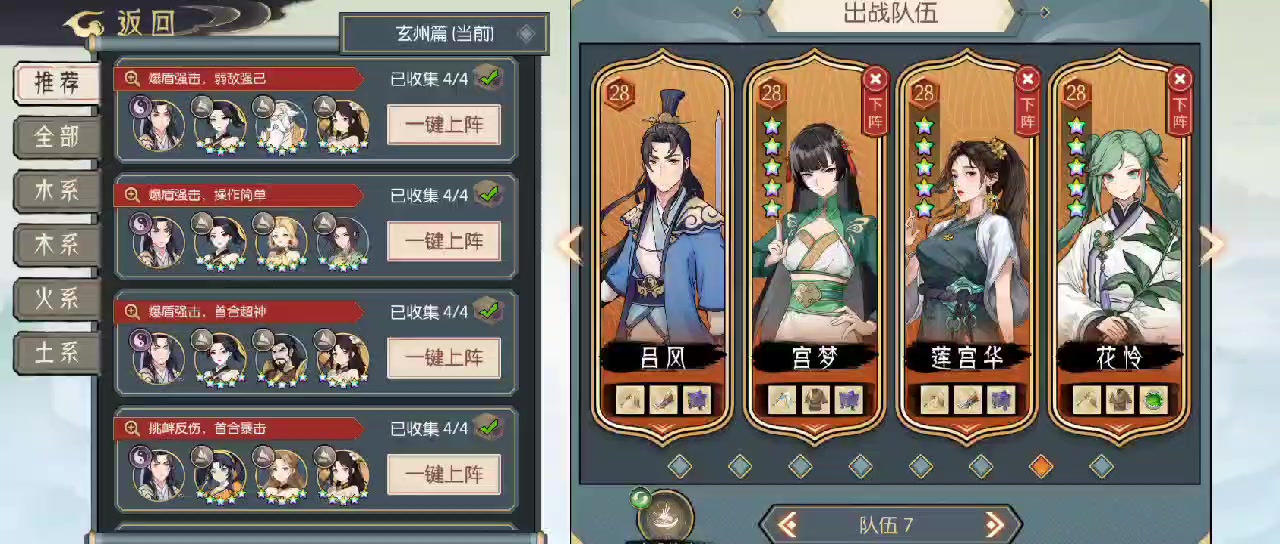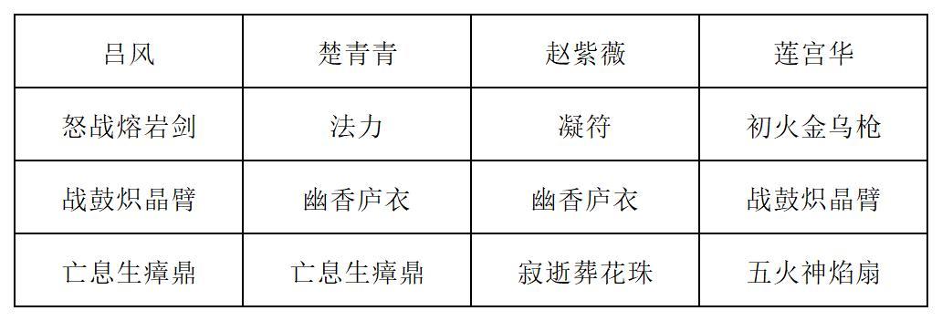 第一回合:赵紫薇打出五行化木咒和毒藤咒,楚青青打出玄天幽藤符和玄藤符,莲宫华打出裂木诀,击杀一只狮王,楚青青打出归一诀,赵紫薇打出寂逝葬花诀,击杀第二只狮王,吕风复制寂逝葬花诀,莲宫华打出五火神焰,击杀一轮狮王,莲宫华打出枯木咒,赵紫薇打出追风咒,吕风打出两张寂逝葬花诀击杀一轮狮王,莲宫华斩带毒的狮王,回合结束之后另一只被毒死,结束战斗。如果莲宫华一刀砍不死狮王可以带个剑雷丹辅助输出。