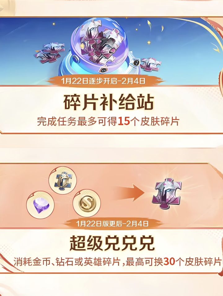 1月22日版本更新后,碎片商店将新增 鲁班七号-班班快跑 勇者皮肤,定价48皮肤碎片/488点券。同步开启碎片补给活动,完成任务最多可得15个皮肤碎片,另有“超级兑兑兑”活动,消耗金币、钻石或英雄碎片最高可换30个皮肤碎片。