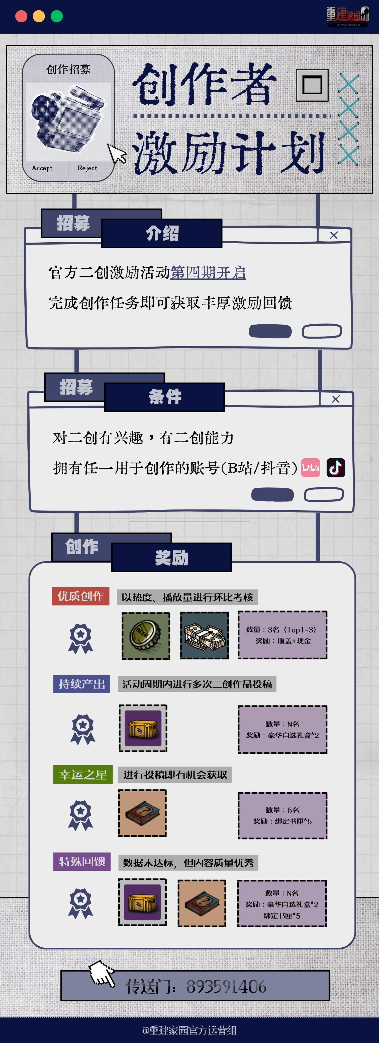 >>创作激励分为优质作品奖、持续产出奖、单期幸运奖、特殊回馈奖,具体任务及奖励请进群查看(《重建家园》官方二创群:893591406)