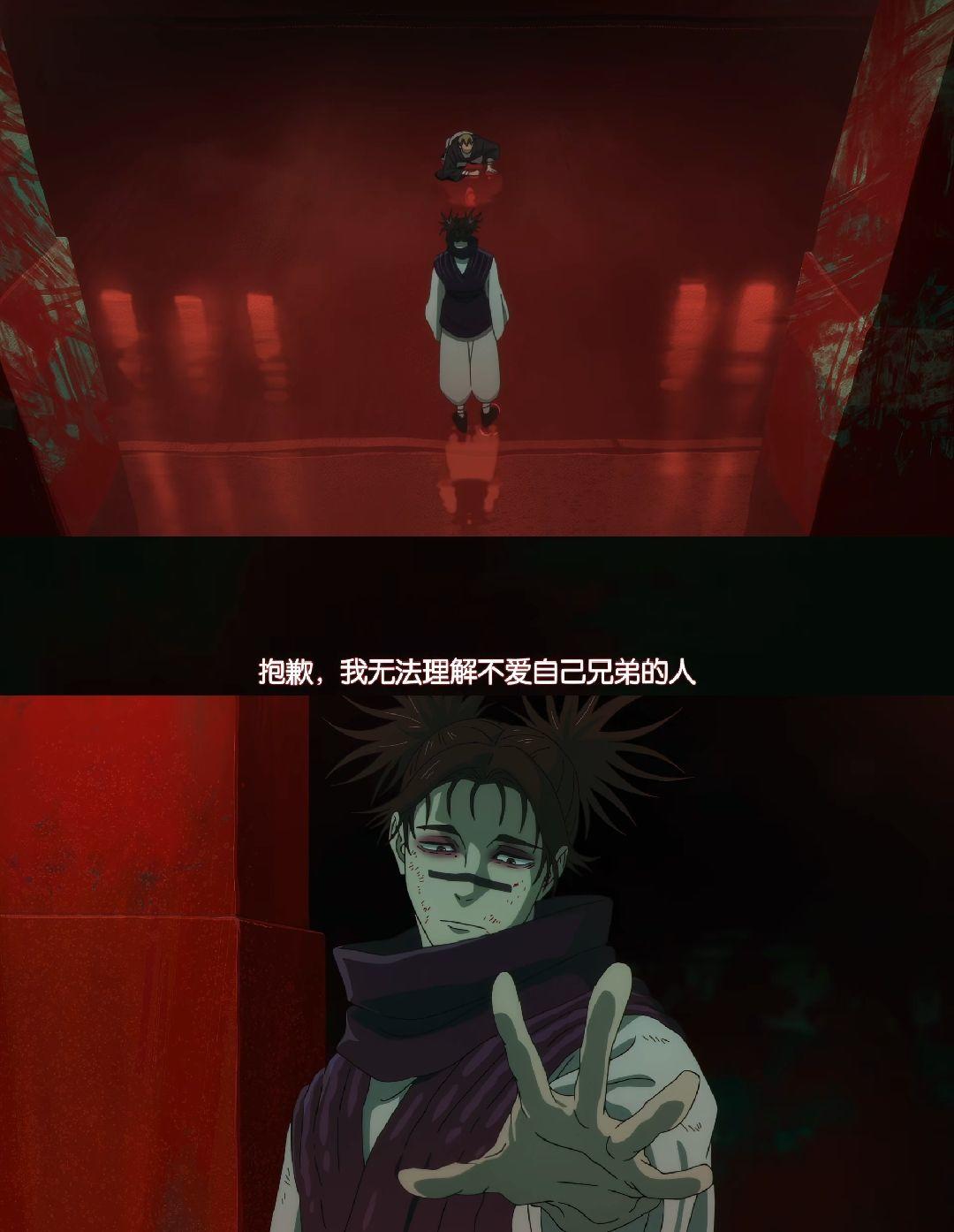 掌握情报差的直哉甚至掏出了大多数咒术师们不屑于携带的武器,再加上此时动画主色调为直哉的黄色,原本就压着胀相打,现在还捅了欧尼酱一刀,胜利的天平基本上倾向了直哉。甚至还有闲工夫和胀相聊上了对兄弟的看法。说来也是比较讽刺,作为咒术御三家,禅院家主的理论继承人(虽然因为突发情况变成了伏黑),正义的咒术师,在对于手足兄弟价值观上居然比不上半咒灵,在之前一直处于反派的胀相,不过这也让我们对直哉如此病态想法的缘由产生好奇。如果动画能把直哉刻画的讨喜一点的话白糖是会这样想的,所以白糖的初观感完全没想那么多()伴随着动画背景色调的转变,属于胀相的反击号角,在顷刻间打响。