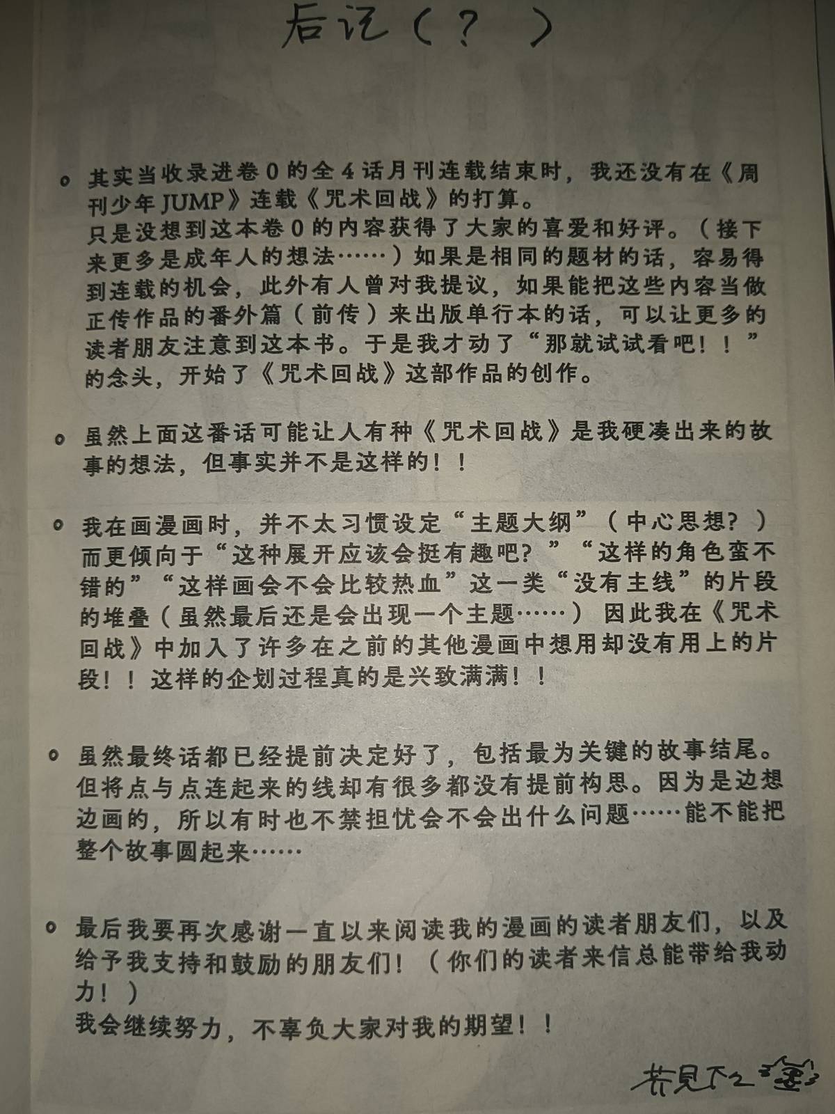 对于直哉来说,这是史无前例的大翻车,以身入局争取禅院家主之位差点把小命搭进去了,虽然很不想……这样说,但直哉的“自以为是”确实是白糖阅读出来的形象。甚至如果不是乙骨忧太赶来,直哉很可能就此退场了。对于其他作者,这样铺垫了很多的角色两话下线是很可惜的,但这是芥见下下()。在《咒术回战 0》的后记中,芥见下下是这样说的:• 我在画漫画时,并不太习惯设定“主题大纲”(中心思想?)而更倾向于“这种展开应该会挺有趣吧?”“这样的角色蛮不错的”“这样画会不会比较热血”这一类“没有主线”的片段的堆叠(虽然最后还是会出现一个主题……)因此我在《咒术回战》中加入了许多在之前的其他漫画中想用却没有用上的片段!!这样的企划过程真的是兴致满满!!