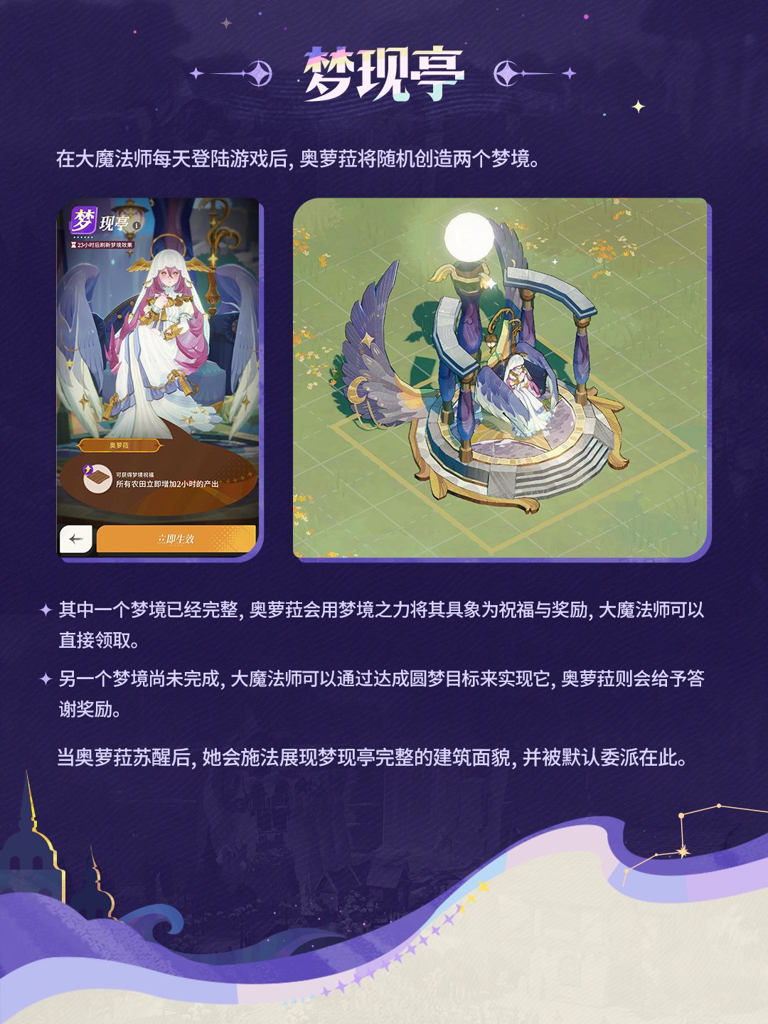 1.6.1版本更新后,大魔法师每日登录即可触发奥萝菈的梦境祝福——其中一个梦境已经完整,奥萝菈会用梦境之力将其具象为可以直接领取的祝福与奖励;另一个梦境尚未完成,大魔法师可以通过达成圆梦目标来实现它,奥萝菈则会给予答谢奖励。