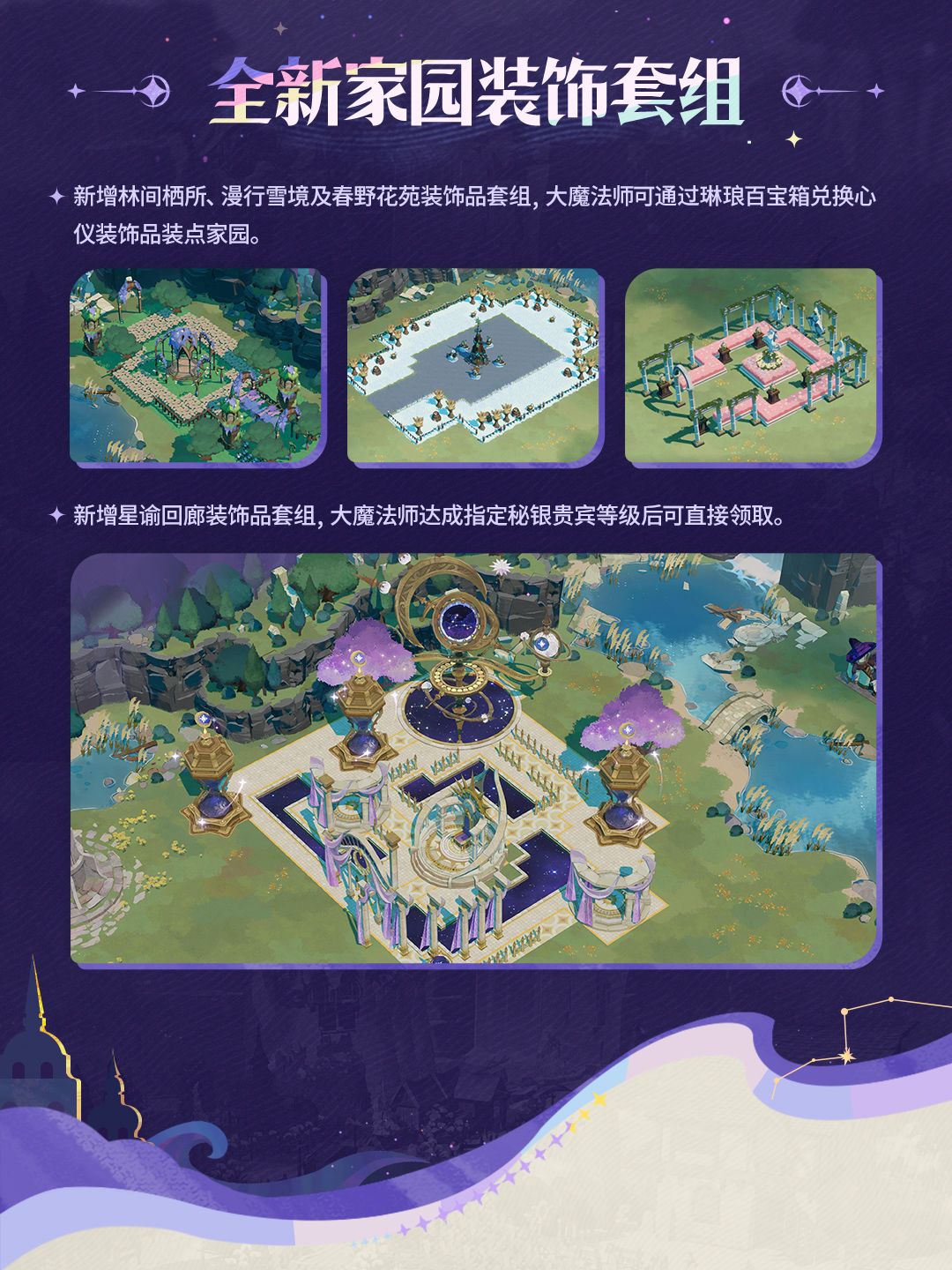 本次更新还新增了林间栖所、漫行雪境及春野花苑装饰品套组,大魔法师可通过琳琅百宝箱兑换心仪装饰品装点家园。大魔法师达成指定秘银贵宾等级后可直接领取星谕回廊装饰品套组。