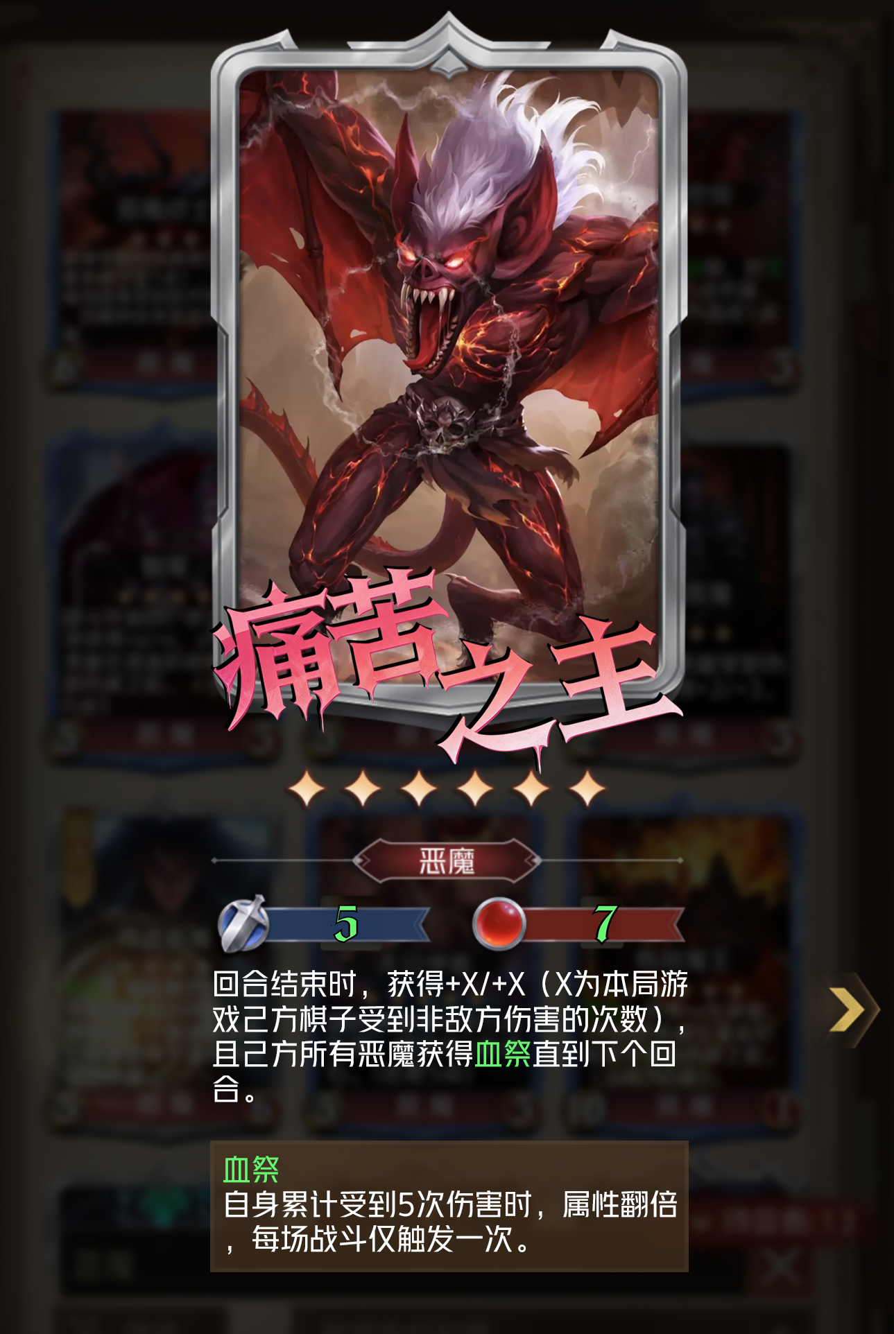 负伤流的核心大哥,如果你玩的时负伤流,则6星痛苦之王每回合都能获得大量属性,成为队伍咯第二个C位,防止清道夫单C被针对的可能性。同时为所有恶魔获得血祭,当己方恶魔战斗中累计受到5次伤害后会获得属性合一个随机技能。让其在战斗中有更好的表现。配合<苦痛之鞭>能快速触发血祭技能让恶魔成为战场的主宰。