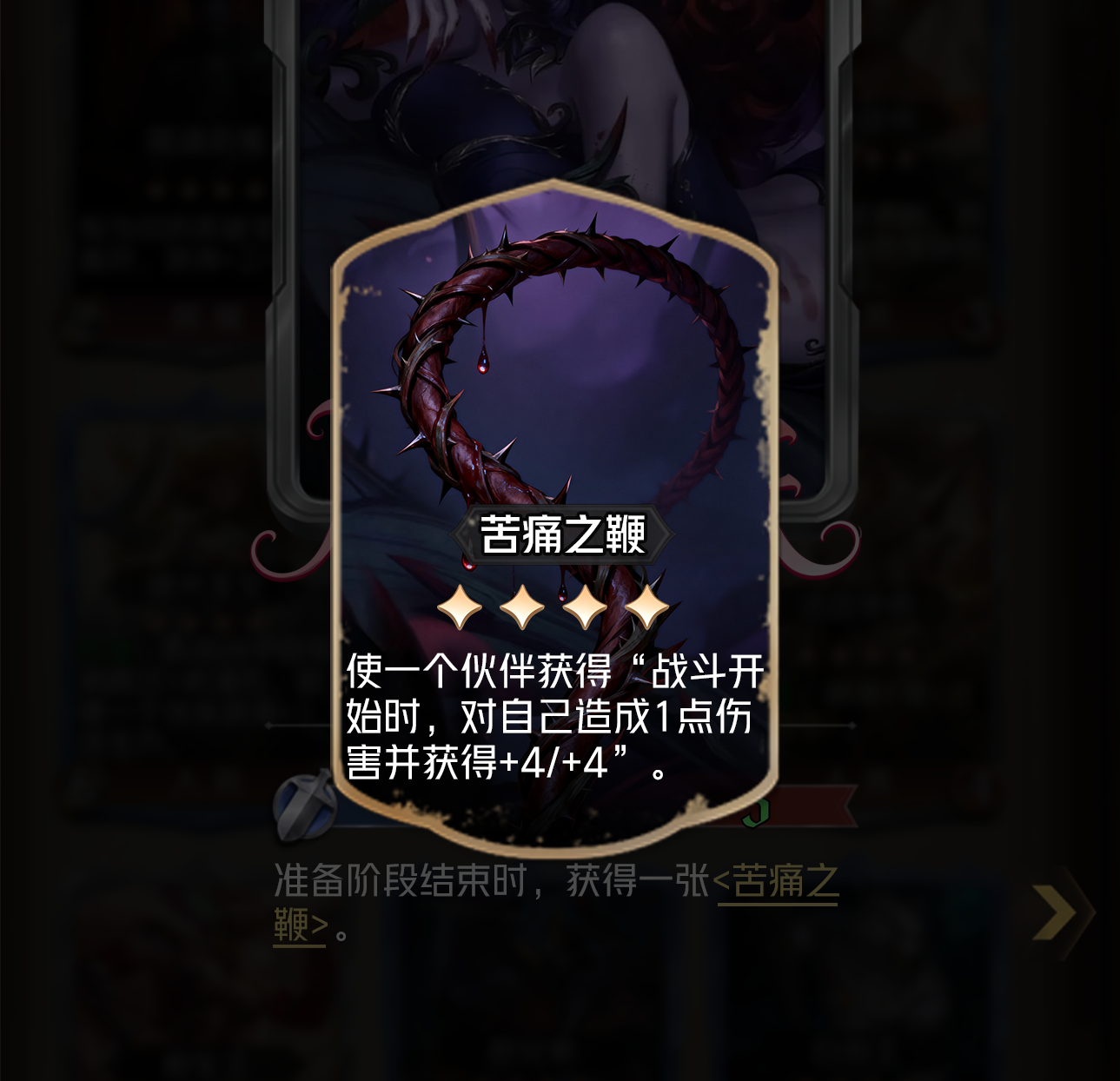 <苦痛直鞭>:选择一个己方棋子,他获得:战斗开始时,对自己造成1点伤害并获得+4/+4。
