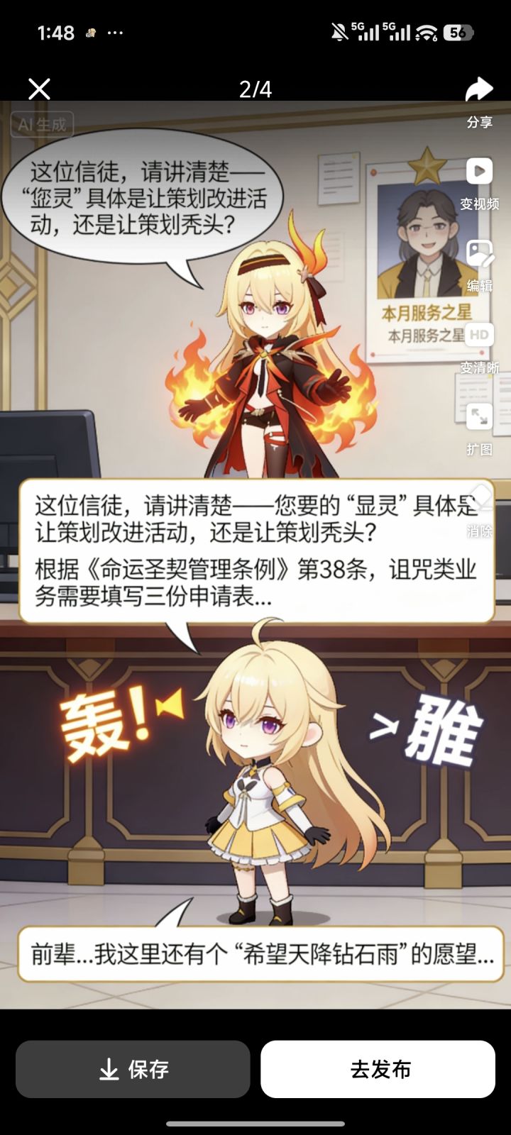 焰舞: (头冒火苗)这位信徒,请讲清楚——您要的“显灵”具体是让策划改进活动,还是让策划秃头?