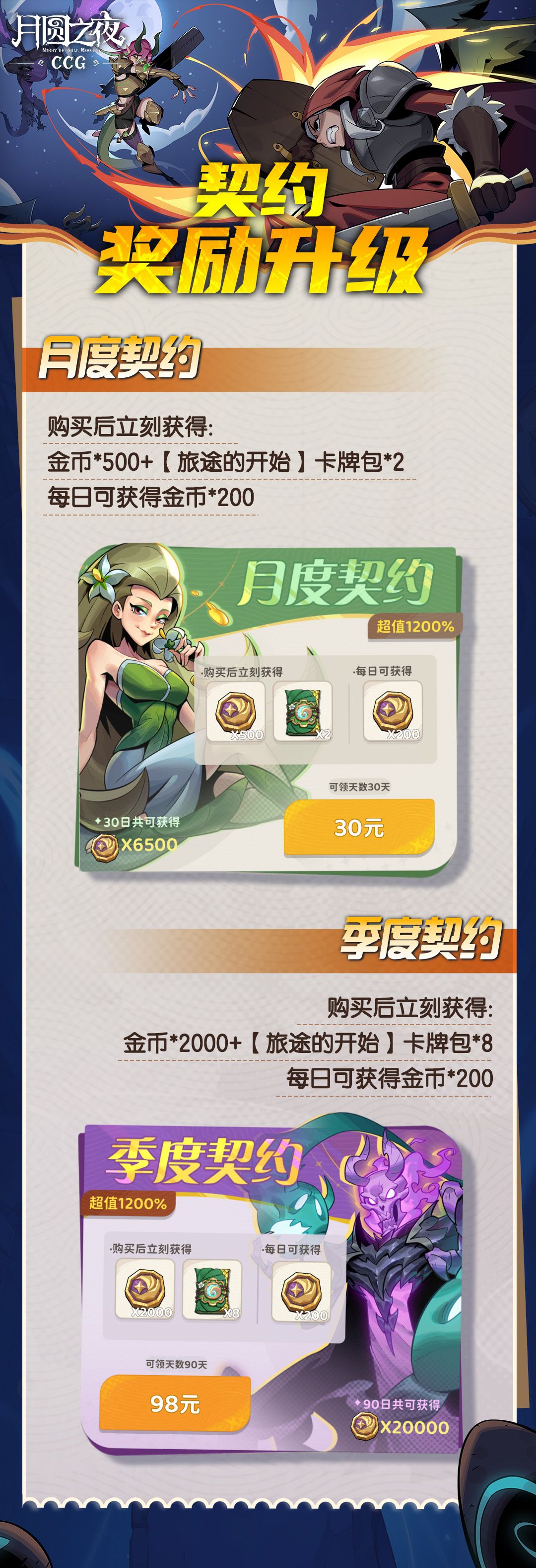 🎁 新手开荒必备:月度 / 季度契约任选,立得金币 + 卡包,每日再领稳定收益!