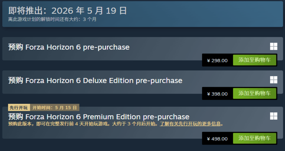 《极限竞速:地平线6》正式公布Steam国区售价并开启预售,游戏定档5月19日发售。其中标准版298元,豪华版398元,高级版498元且可提前4天解锁。