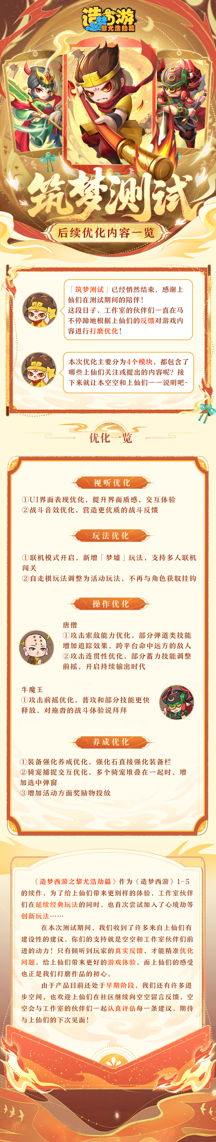 上仙们好呀~《造梦西游之黎尤浩劫篇》「筑梦测试」已圆满落幕。感谢各位上仙的关注与参与,在本次测试期间,我们收到了许多来自上仙们有建设性的建议,你们的支持就是空空和工作室伙伴们前进的动力!只有倾听到玩家的真实反馈,才能精准优化问题,给上仙们带来更好的游戏体验,而上仙们的感受也正是我们打磨作品的初心。