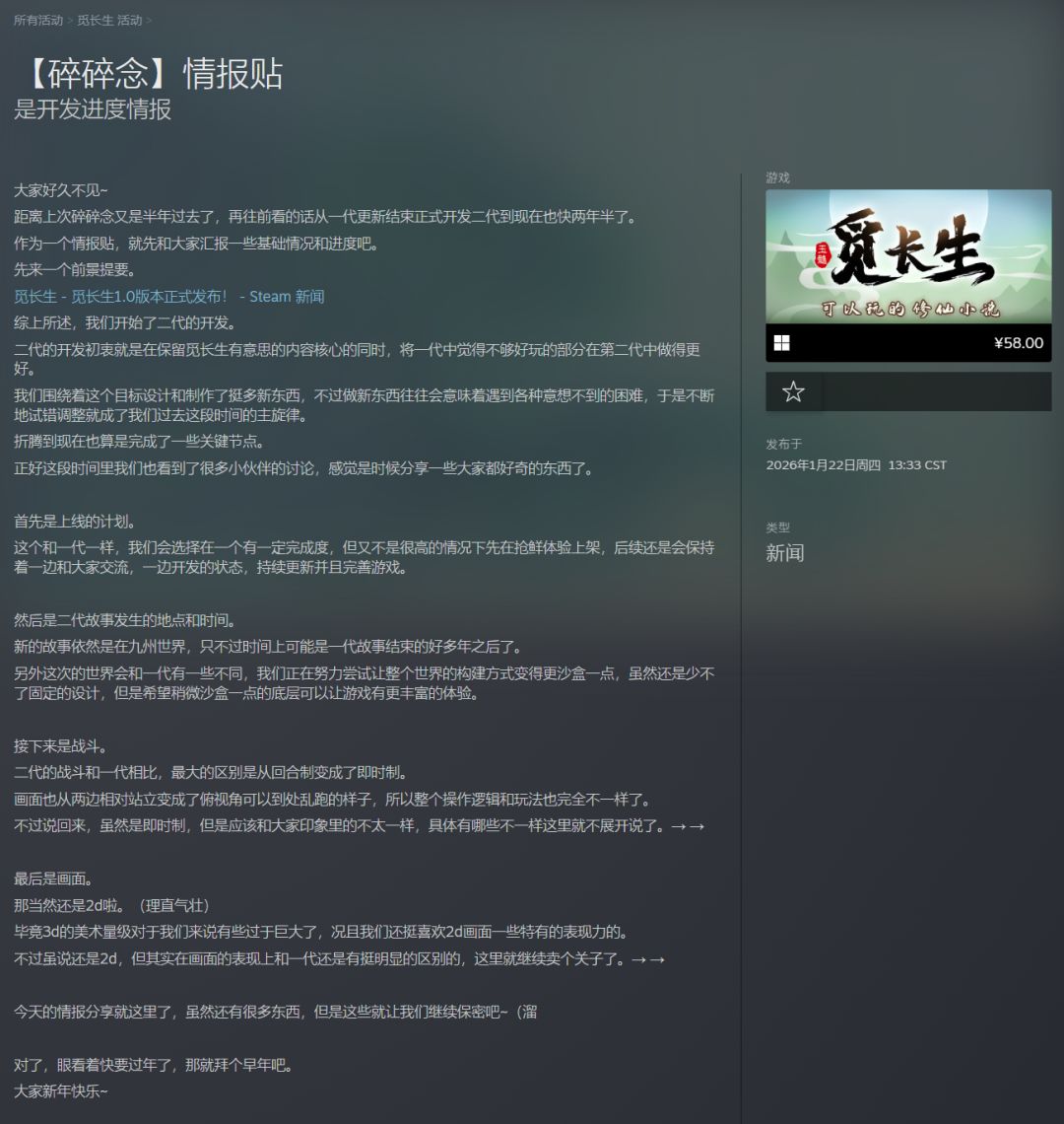 《觅长生2》全新核心情报正式公开,这款续作确定将以抢先体验版本上架,将在具备一定完成度的阶段与玩家见面,后续开发团队会持续更新内容,不断打磨完善游戏体验。