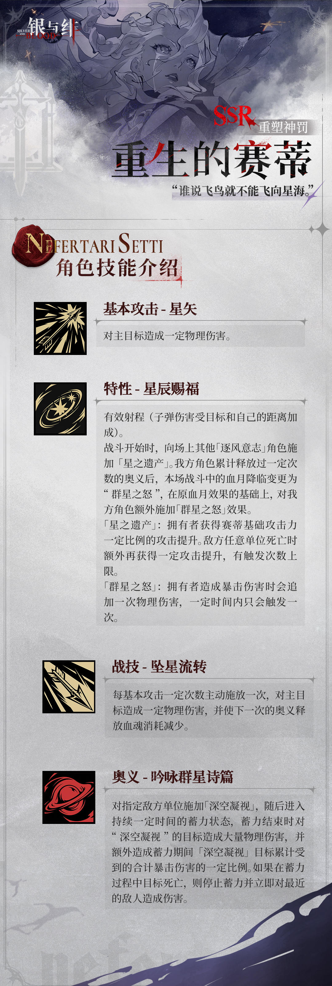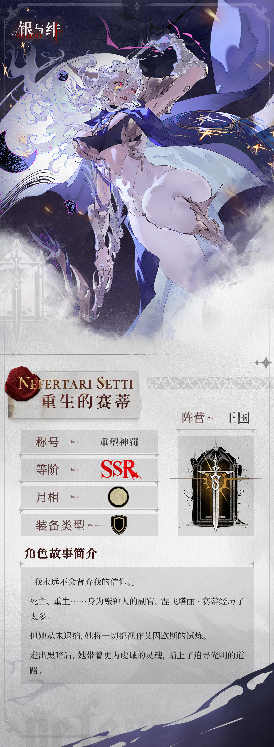 死亡、重生……身为敲钟人的副官,涅飞塔丽·赛蒂经历了太多。但她从未退缩,她将一切都视作艾因欧斯的试炼。走出黑暗后,她带着更为虔诚的灵魂,踏上了追寻光明的道路。