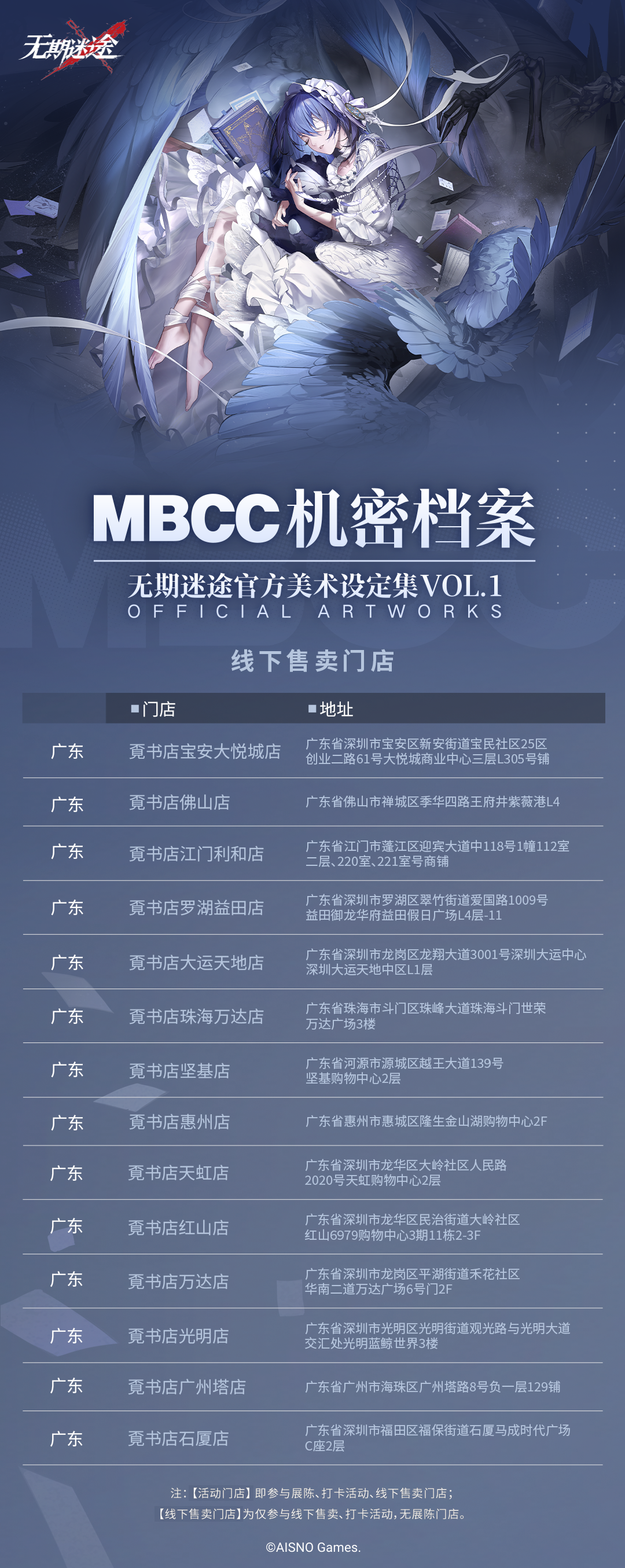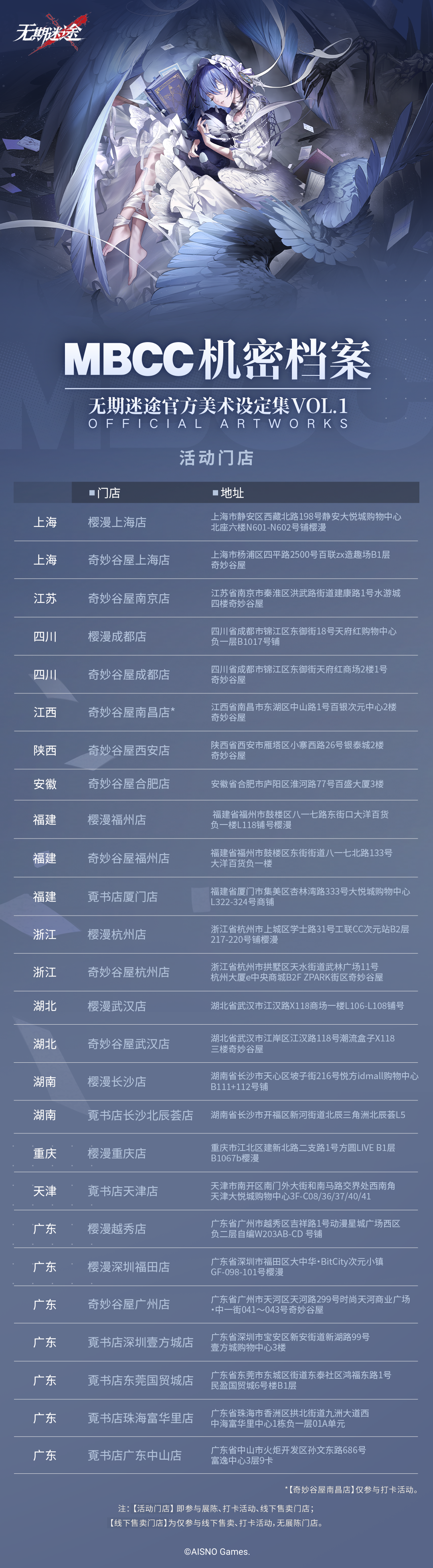 在活动时间内,到联动展陈门店内拍摄精美展陈照片,带话题词#MBCC机密档案# #无期迷途设定集#,发布到任一社交平台中;凭发布记录到店即可领取【线下审阅印章—盖章资格】及【盖章卡】一张。