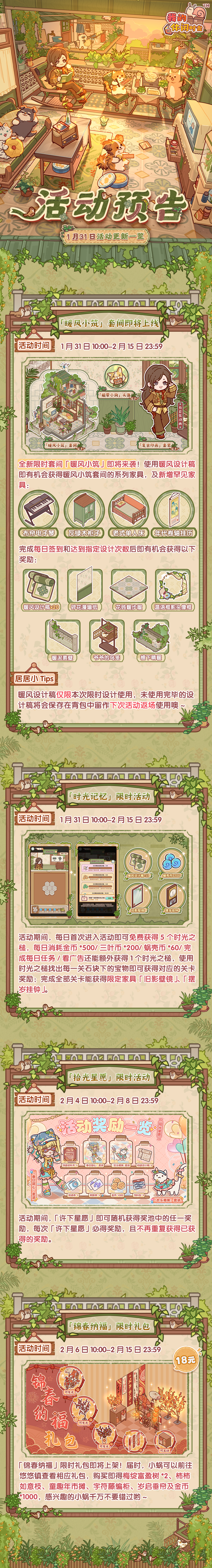 🍃限时活动「时光记忆」即将开启!参与活动即有机会获得暖风设计稿*11、蜗壳币*200、限定家具「旧影壁镜」、「摆岁挂钟」,还有「拾光星愿」限时活动、「锦春纳福」限时礼包即将上线,感兴趣的小蜗可以来看看哟~
