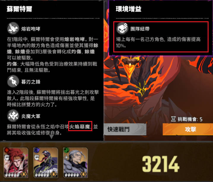本期推出的夜幕降临为苏尔特尔,火焰巨人会有单体Boos阶段跟群体小怪,并且看环境增益【团队纽带】场上没有一名已方角色造成伤害提高,所以也是给到猛毒有能力上场的机会,玩家或少选择猛毒来对抗小怪,不过我只是这样说,角色跟召唤单位是要区分的。
