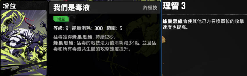 蜂巢思维会使猛毒的战技法力值消耗减1点,并且猛毒与共生体的攻速提升96%。