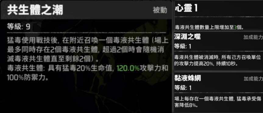 这两个天赋,就需要猛毒频繁让共生体在场上做工,增共生体是为了抗伤,减共生体是为了让召唤单位增伤,其输出还是弱,就还是要看你的召唤单位输出如何。
