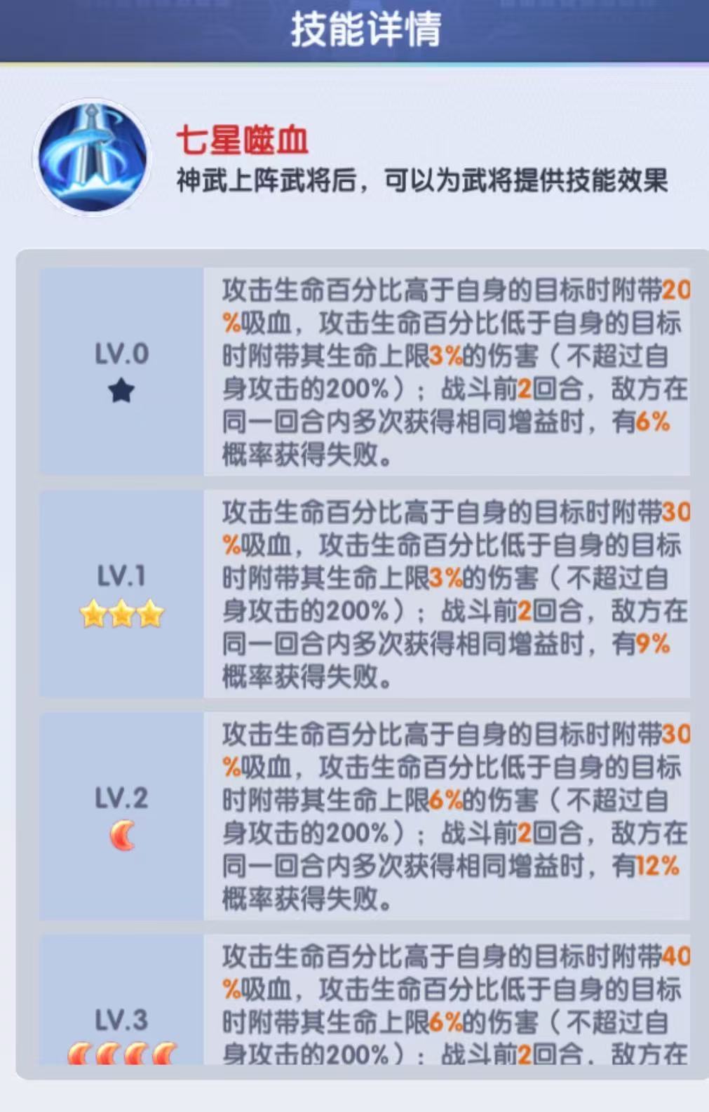 七星刀的核心价值体现在伤害加成上,每次攻击附带目标生命值 9% 的伤害,搭配群攻武将时推图效果极佳。升星无需追求满星,其升星对自身伤害的提升幅度有限,主要作用是解锁更多佩戴位,能为所有群攻、出手次数多的输出武将佩戴即可;此外该神武能让敌方同一回合的相同增益有概率失效,对赵云、关羽等叠 BUFF 类武将有一定克制作用,建议至少激活开图鉴。