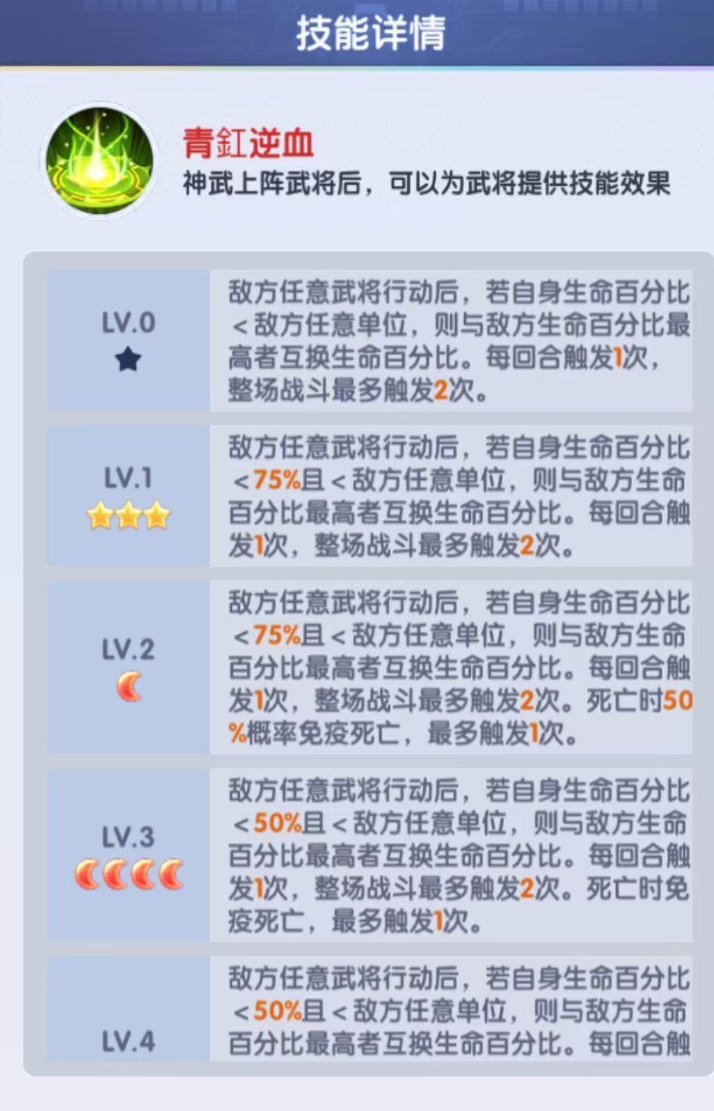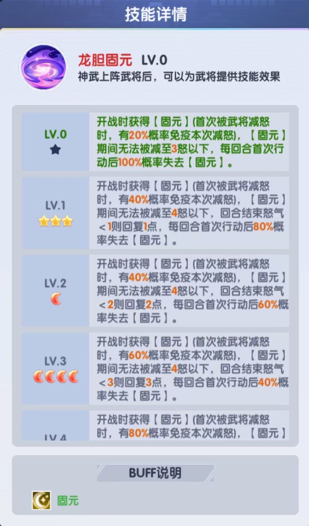 核心一为怒气流联动,满星能保证换怒后仍有 4 点怒气开大,效果触发于敌方武将行动后,先手方携带优势更明显,且换怒效果可无视龙胆枪的免疫减怒,具备不俗克制作用。