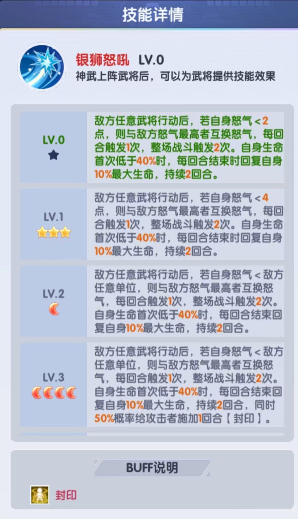 核心二是强力封印效果,佩戴武将被打至半血以下时,会对攻击者触发 1~2 回合封印,被封印者的天赋、芯片、神武、哨兵、时装效果全失效(含银狮盔自身),失去各类加成后武将战斗能力会大幅下滑。也正因这一效果,不少低战玩家能成功越战高战,满星后的银狮盔,能为队伍战力提升带来显著助力。