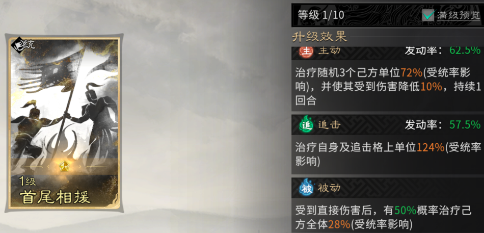 高顺:主动技能固定携带【首尾相援】,对我方随机三个单位造成回复,并提供全队10%的减伤。