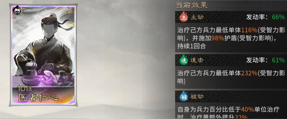 追击技能固定携带【医者仁心】黄月英高智力的医者仁心能为队伍提供回复。