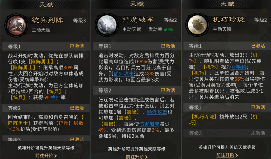黄月英:主动技能固定携带【通权达变】,降低敌方攻击并有概率施加【技穷】(无法发动主动技能);