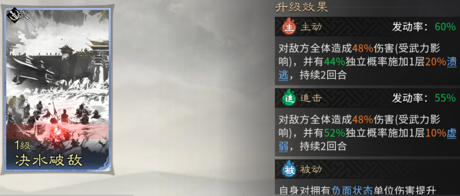 追击技能固定携带【决水破敌】,完美适配张辽的天赋,为对面全体挂上震慑和虚弱效果,近一步降低对面的伤害。