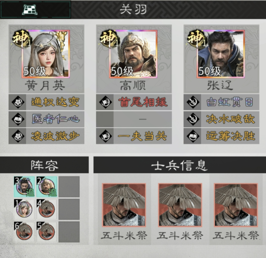 兵种站位:安排三个五斗米祭占满后两排的格子,保证黄月英施放觉醒技召唤的木牛流马会在最前排帮助队伍承伤,三个五斗米祭的奶量来保证队伍夸张的续航能力。