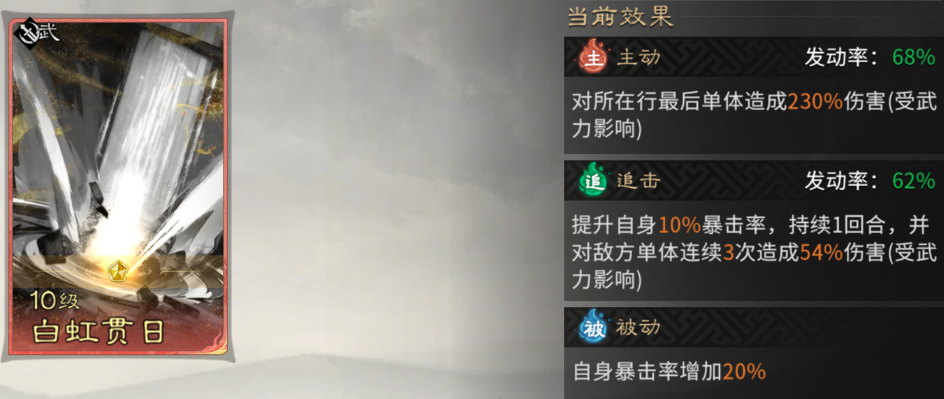 张辽:主动技能固定携带【白虹贯日】,完美适配张辽的主打后排的特性,拥有可观的伤害数值。