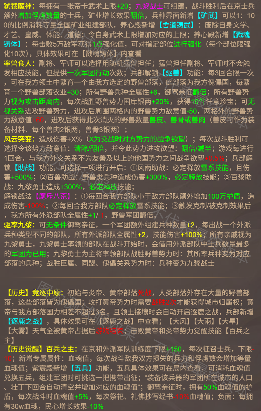 蚩尤的权能,彰显于对“野兽”与“自然”的绝对支配。您乃百兽之主,可驱使猛兽担任军师副将,所有野兽兵种将获得本质飞跃。您不但可以培养野兽傀儡,组建“百兽大军”,更可通过秘术在领土中培育野兽部落,将蛮荒之力化为己用,构建一套基于狩猎与征服的资源循环体系。