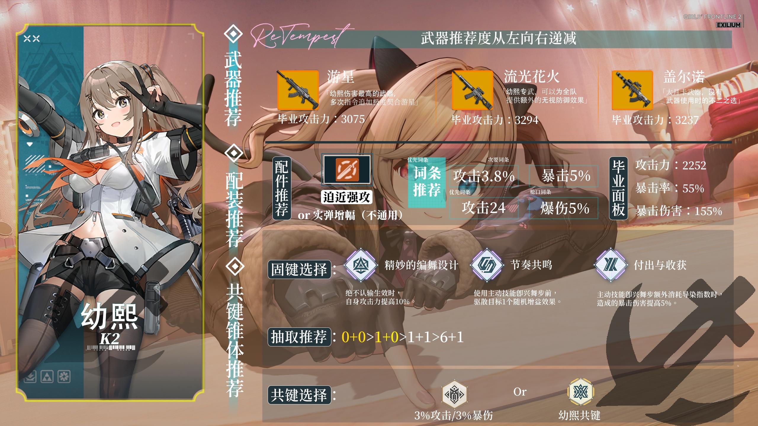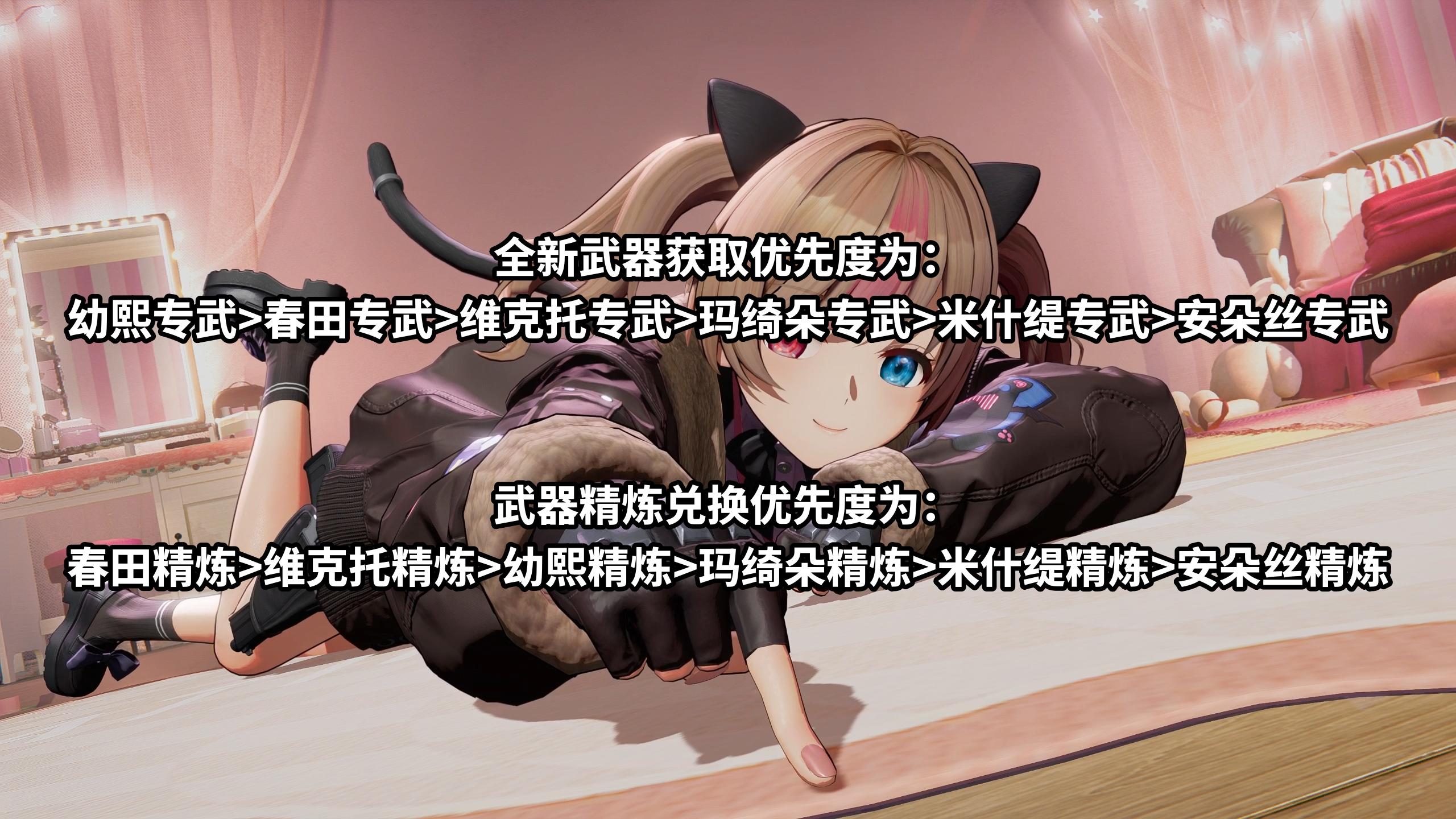 武器精炼兑换优先度为:春田精炼>维克托精炼>幼熙精炼>玛绮朵精炼>米什缇精炼>安朵丝精炼这里也给出了专武和角色的对照表,供各位指挥官们使用~