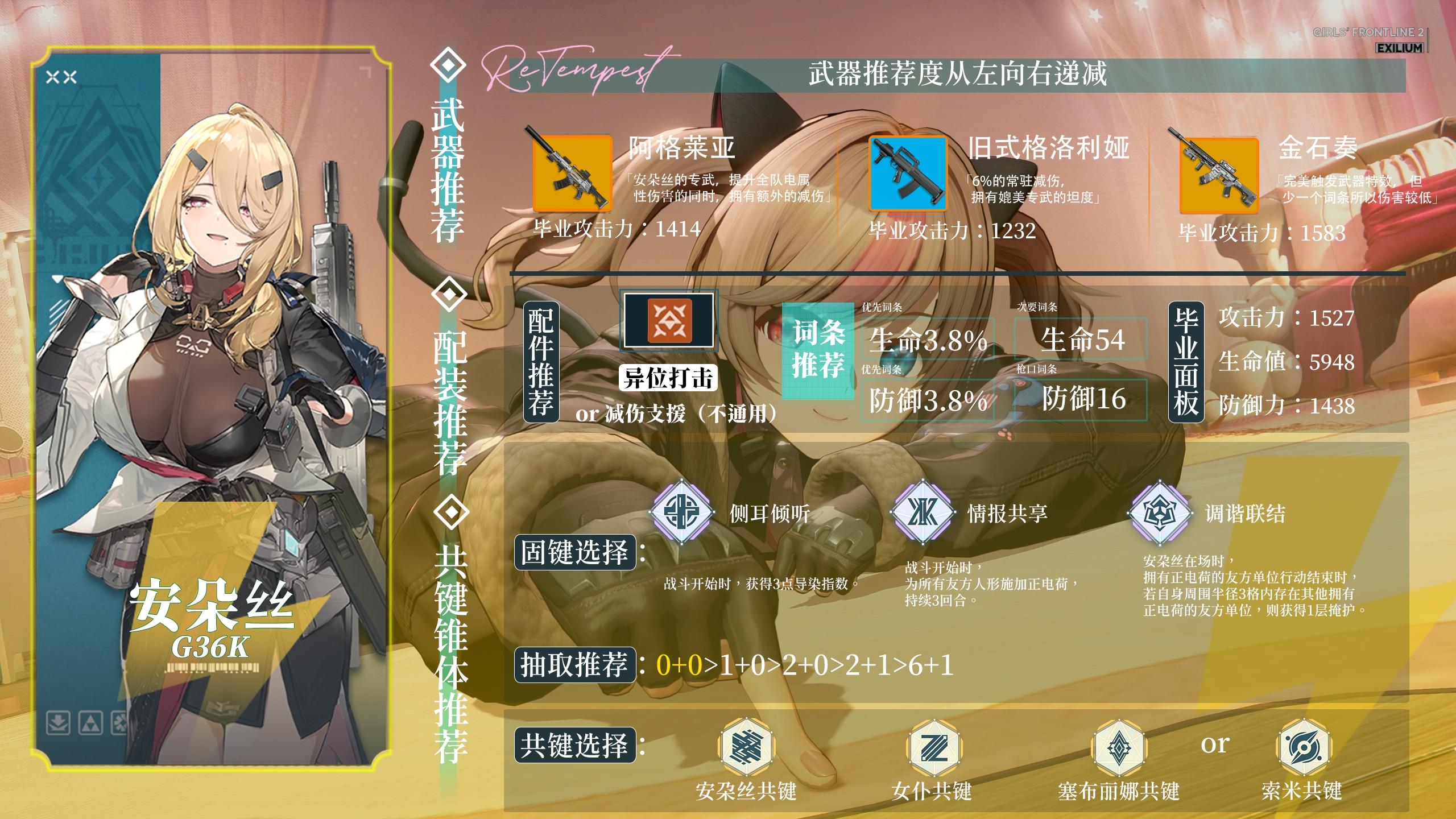 安朵丝的推荐也很简单,0椎可以用来平替绛雨,如果有绛雨的情况下0椎安朵丝基本上不了场,评价为npc。如果你有满椎海伦的情况下0椎安朵丝的优先度会提升为顶级。满椎安朵丝辅助数值非常高,但奈何电队现在不是很强,所以评价为顶级。