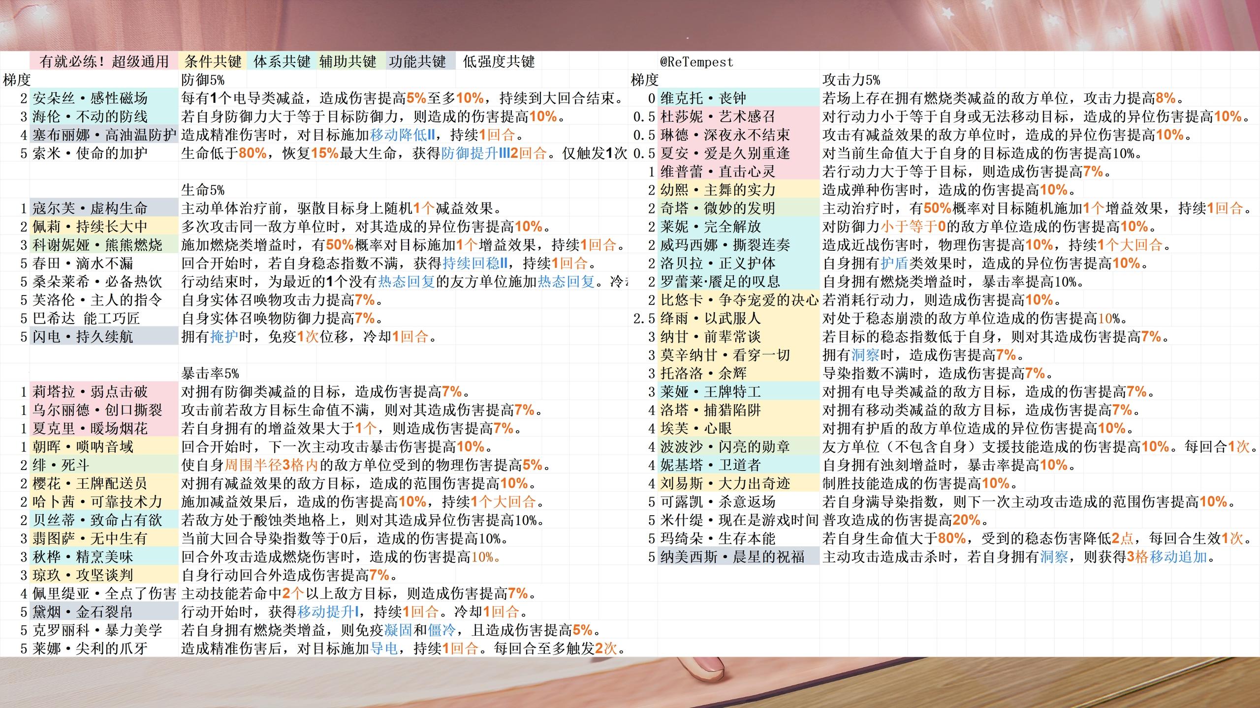 最后第3张图就是标明了每个共键的适配角色以及携带思路,算是一点小小的进阶内容,知其然,更要知其所以然。当然,t3以下的共建我就没有再写了,毕竟也用不太上。这里也留出时间供各位指挥官们截一下图,我本来想把图发在评论区的,但是没有大会员不让发啊QWQ。一图流除了提供了所有共键以外,还对其进行了分类。