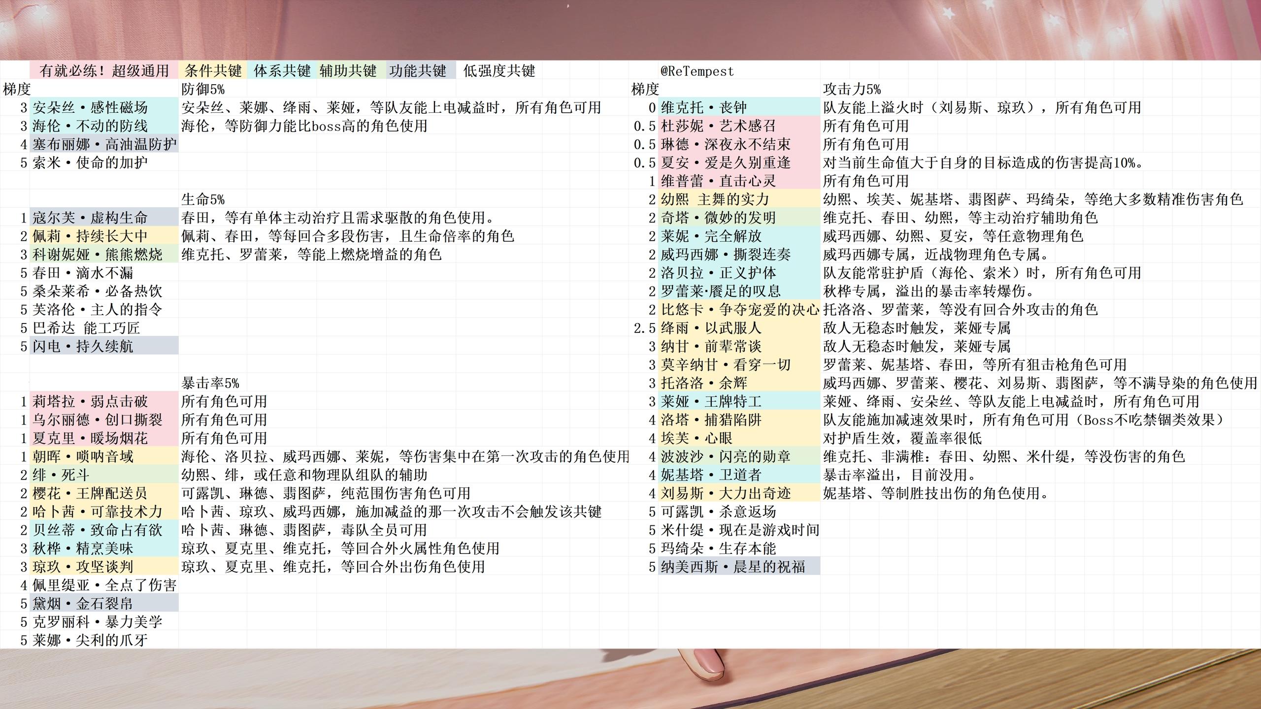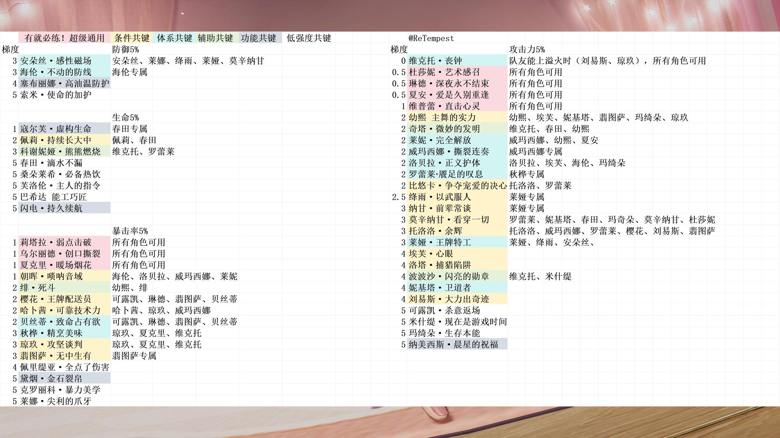 红色标注的共键是条件极其泛用,任何人形都可以使用的共键,有了就必练!主C的共键基本就是从红色的标注里面挑。