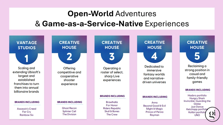 新的运营模式将以5家创意工作室(Creative House)为核心,以期重新实现可持续增长。这轮调整除了发布新的路线图,还包括不少加速降本的举措,以及育碧将取消和延期多个项目,并关闭部分工作室。