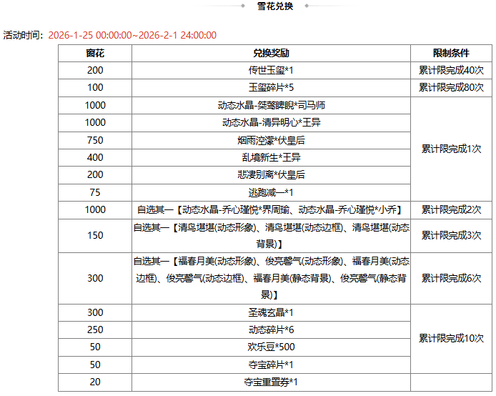 2、雪花 2026-2-2 00:00:00 到期,到期自动删除不回收。传世玉玺未消耗的可用于下期活动;